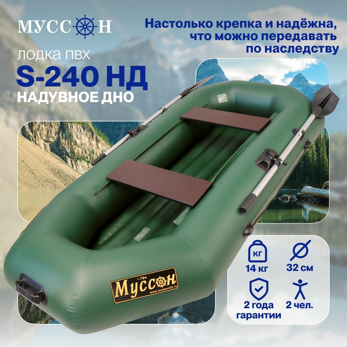 Лодка надувная для рыбалки ПВХ Муссон S-240 НД гребная двухместная с надувным дном, зеленая информация: