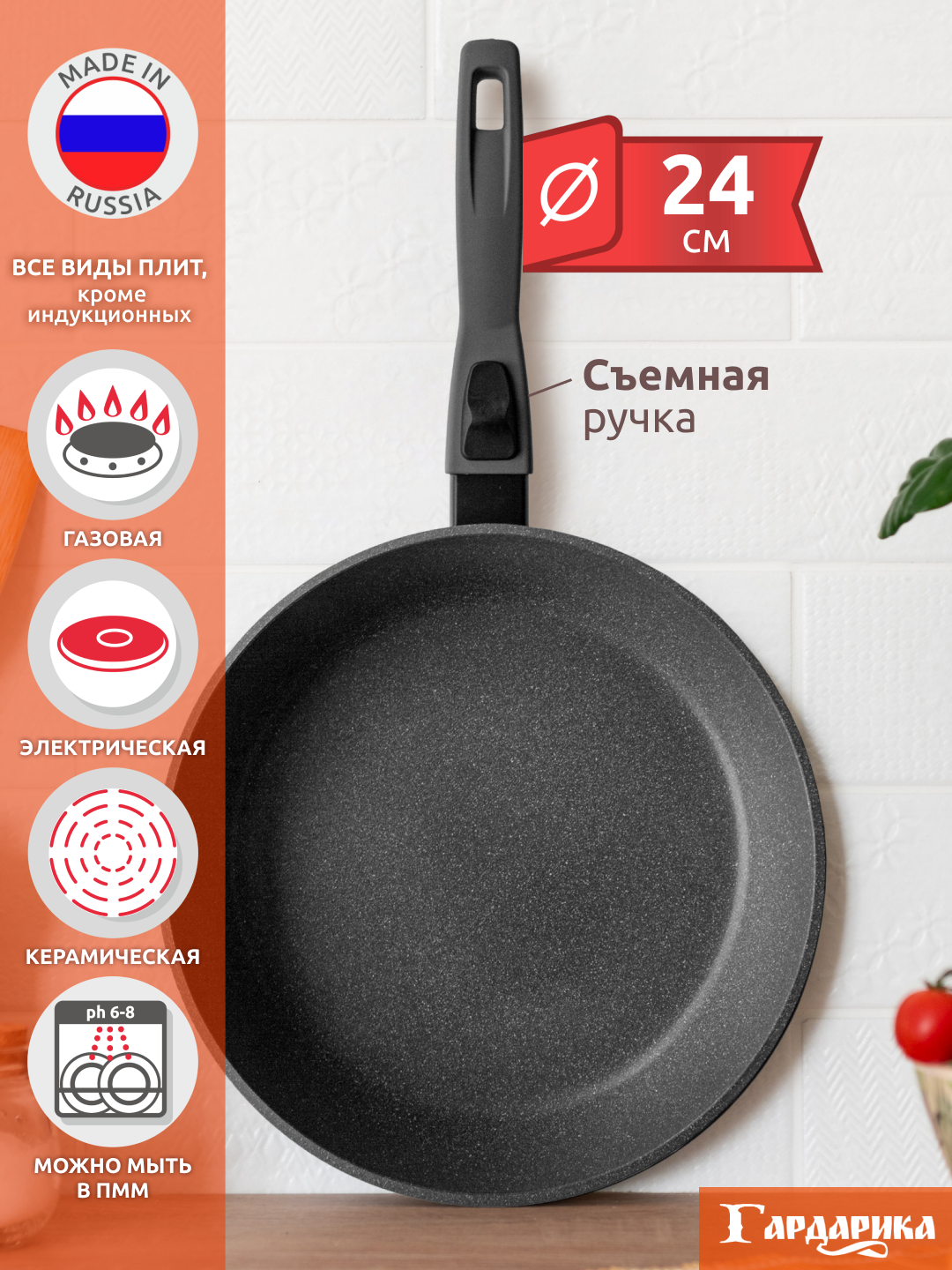 Литая сковорода Гардарика с антипригарным покрытием, съемная ручка, 24 см информация: