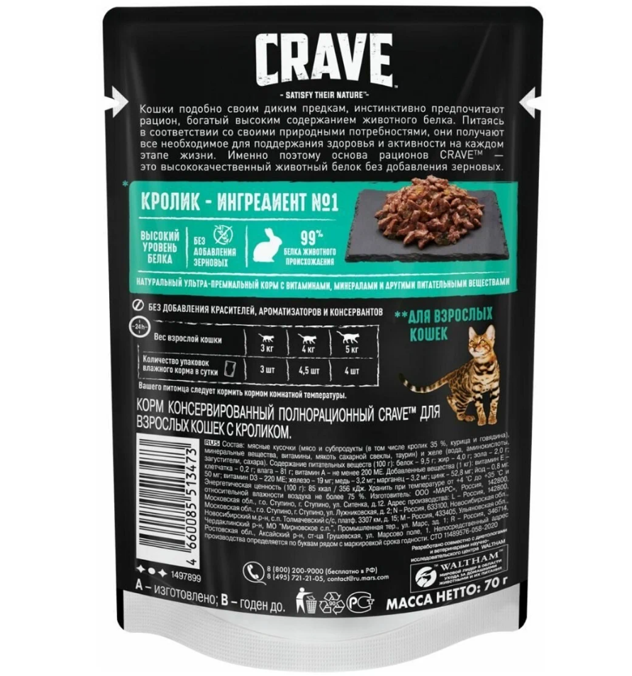 Crave паучи для кошек Кролик 70г (30 паучей) информация: