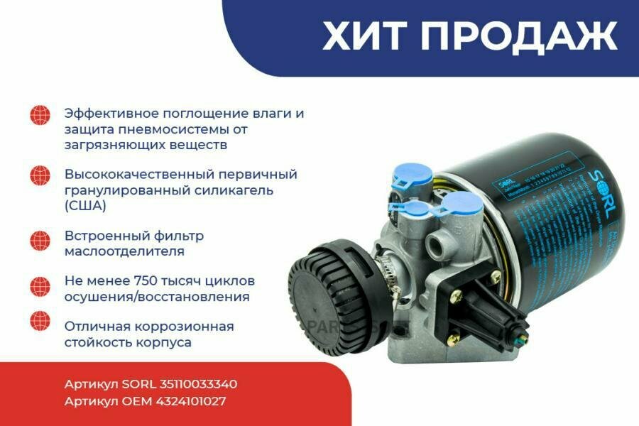 Осушитель воздуха 8.1 bar КАМАЗ (4324101027) SORL (35110033340) информация:
