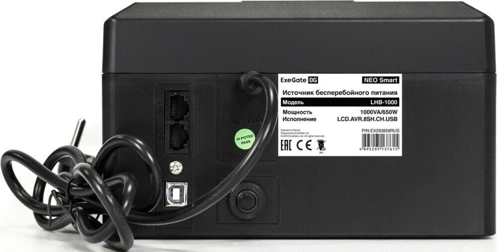 ИБП ExeGate NEO Smart LHB-1000.LCD.AVR.8SH.CH.RJ.USB <1000VA/650W, LCD, AVR, 8*Schuko, RJ45/11, USB, 4*USB-порта для зарядки, Black> EX293858RUS