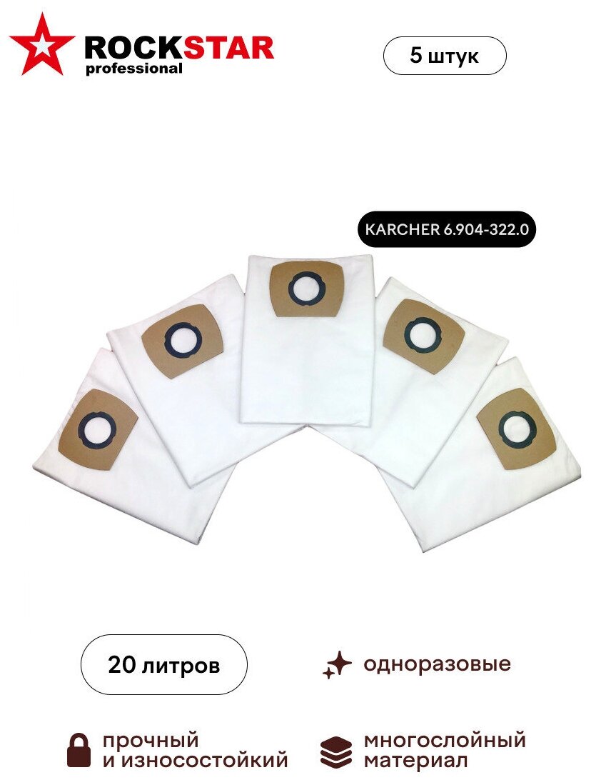Комплект мешков-пылесборников ROCKSTAR professional для пылесосов Karcher WD 3, MV 3, WD 3.000-3999,WD 3.200, 3.300, 3.500 и др., 5 шт
