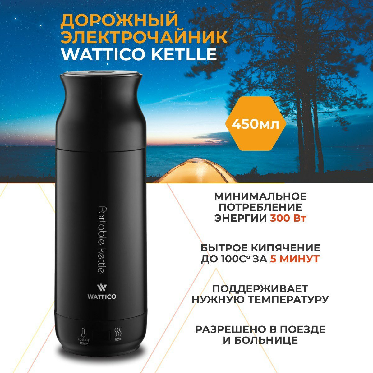 Отзывы на Чайник электрический дорожный мини / термос с регулировкой температуры WATTICO. 300 Вт, объем 0.45 л (черный)