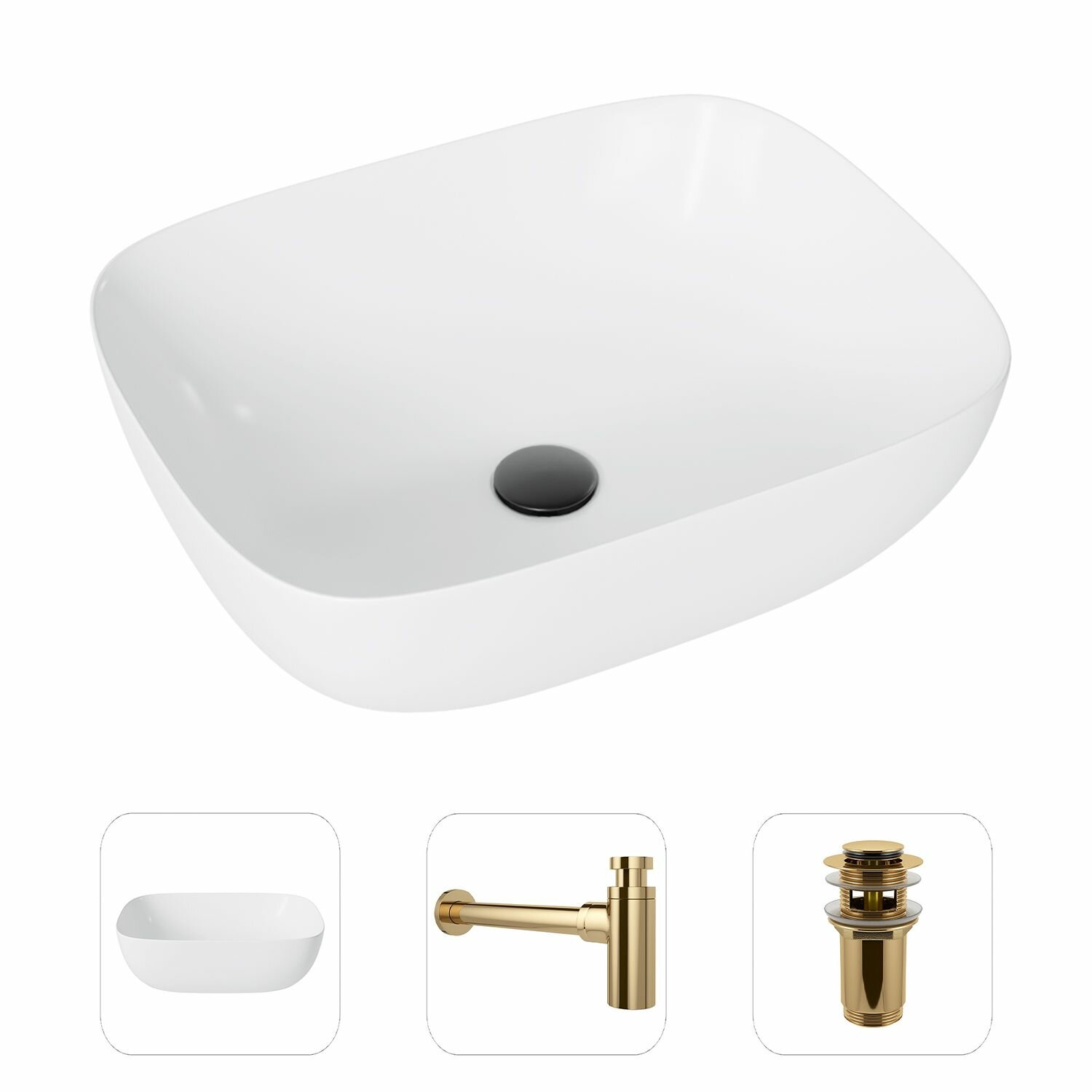 Накладная раковина в ванную Helmken 49349000 комплект 3 в 1: умывальник прямоугольный 49,5 см, сифон и донный клапан click-clack в цвете золото информация: