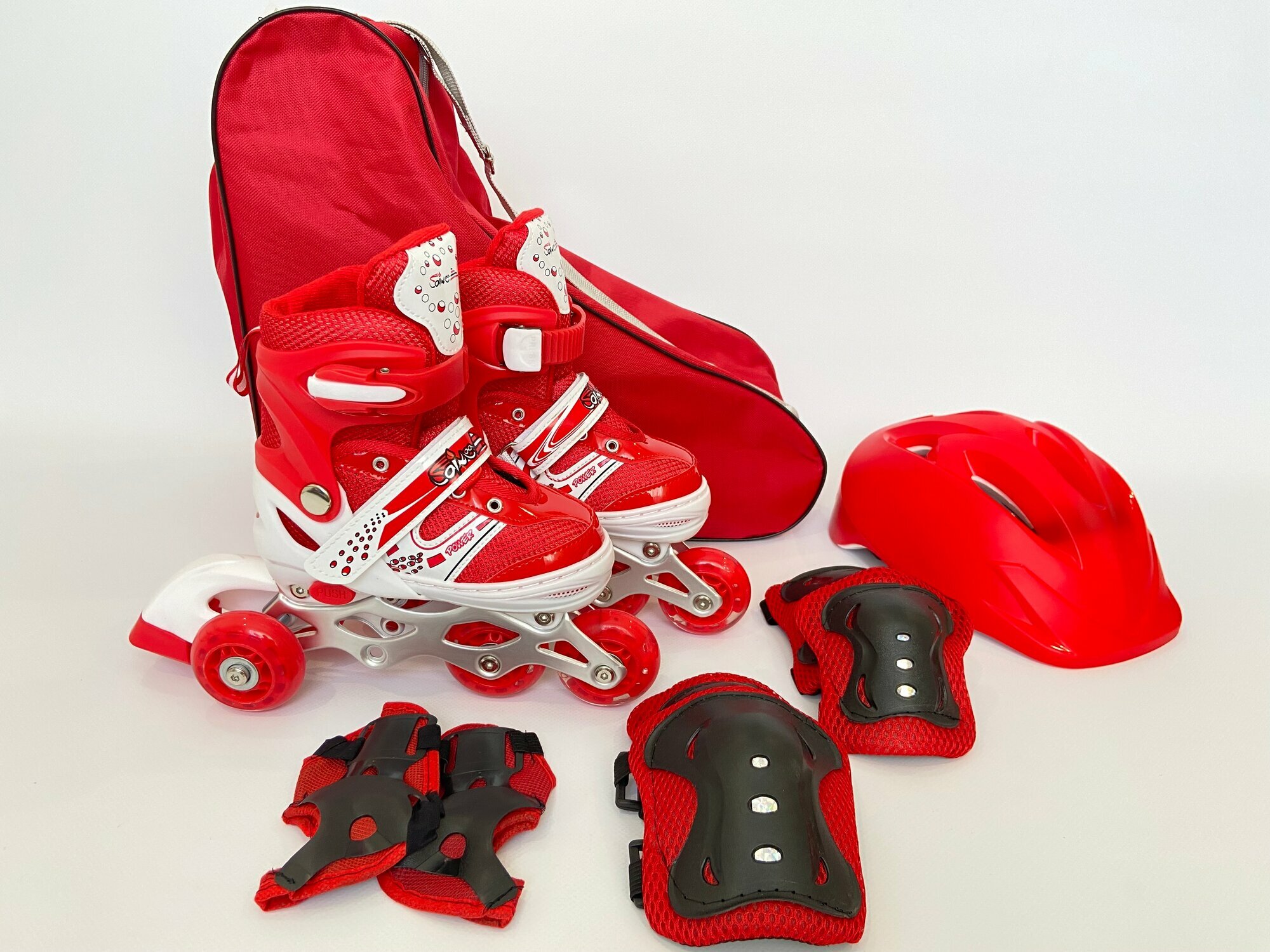 Набор ролики раздвижные + защита размер 31-34 на стопу от 18-20,5 см , колеса гелевые , алюминевая рама красный 3 999 ₽