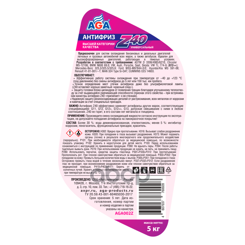 10 цен на Антифриз, Готовый Раствор G12++ -40C, Красный, 5Кг AGA арт. AGA002Z