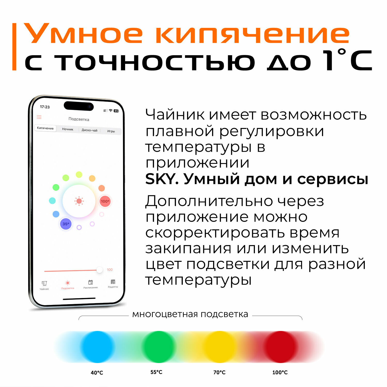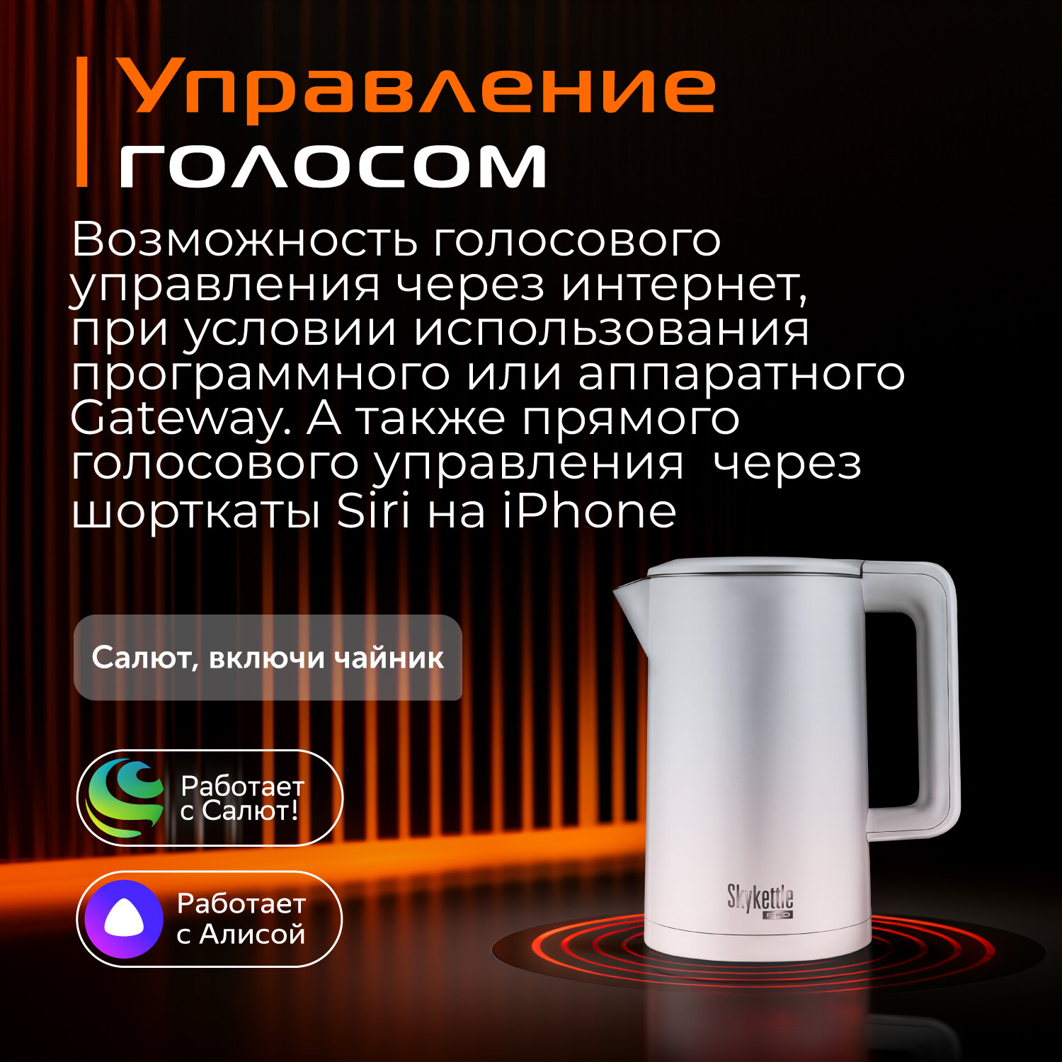 | Дополнительная информация | подсветка многоцветная; мощность: 1850–2200 Вт; напряжение: 220-240 В, 50 Гц; умное кипячение Smart Boil; защита от поражения электрическим током: Класс I; тип стали нагревательного элемента: 304; контактная группа: STRIX; терморегулятор: бесступенчатый (через приложение RFS), ступенчатый (на ручке); индикация работы: светодиодная (RGB), звуковая; мерная шкала градуированная; стандарт передачи данных: Bluetooth v4.0; управляющее приложение: Ready for Sky; голосовой помощник: Алиса, Маруся; поддержка на операционных системах: Android, iOS; материал корпуса: нержавеющая сталь/пластик; автоотключение при закипании; функция нагрева воды без кипячения: 40, 55, 70, 85°C; автоматическое поддержание заданной температуры воды до 12 часов; комплектация: чайник, подставка для чайника, руководство по эксплуатации, сервисная книжка |