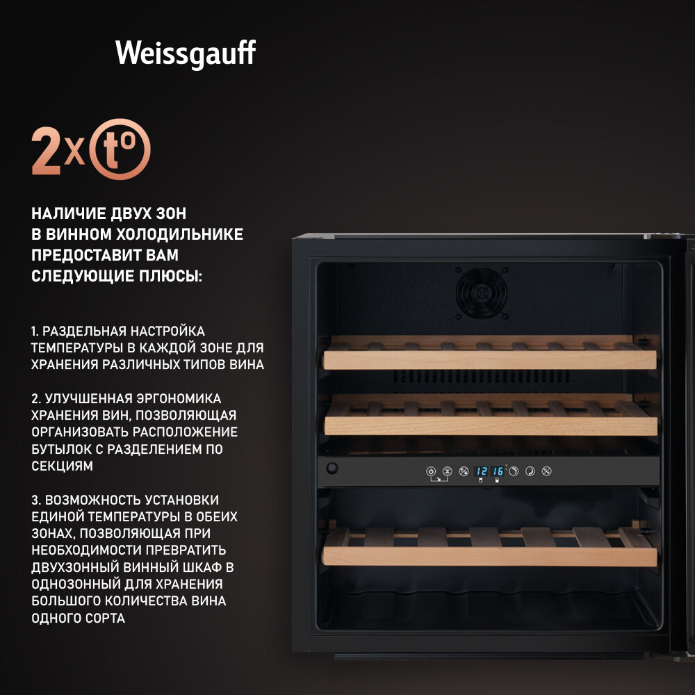 Встраиваемый винный холодильник Weissgauff WWCI-36 DB Dual Zone компрессорный холодильник для вина, 36 бутылок, 3 года гарантии информация: