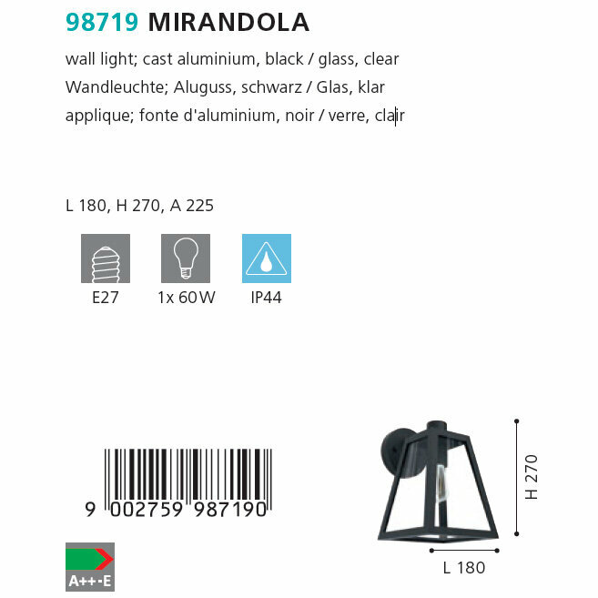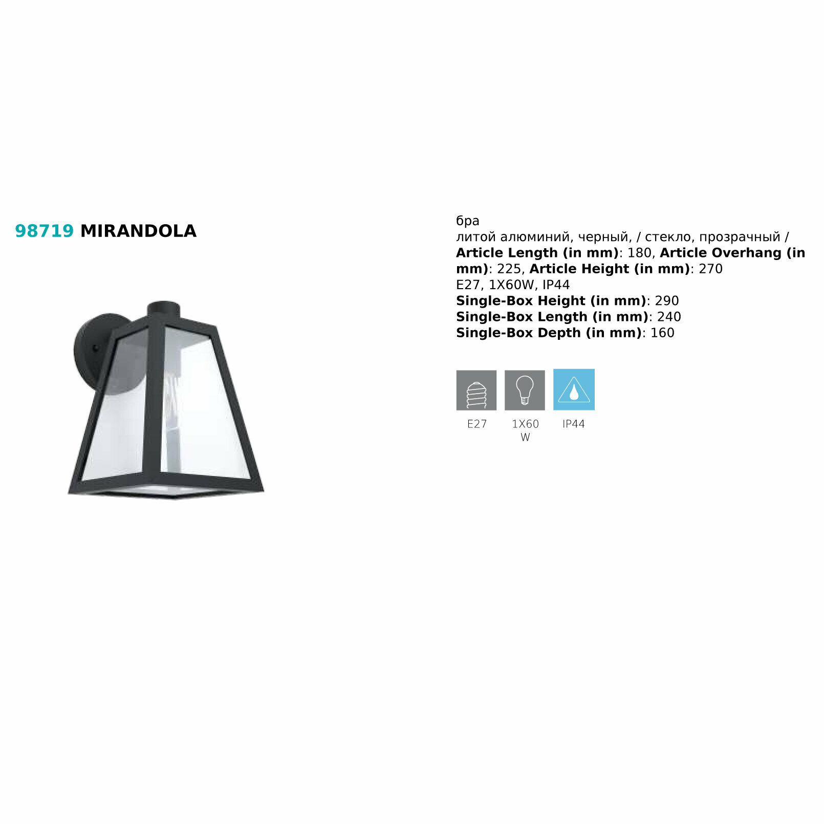 Настенный фонарь уличный Mirandola 98719 IP44 информация: