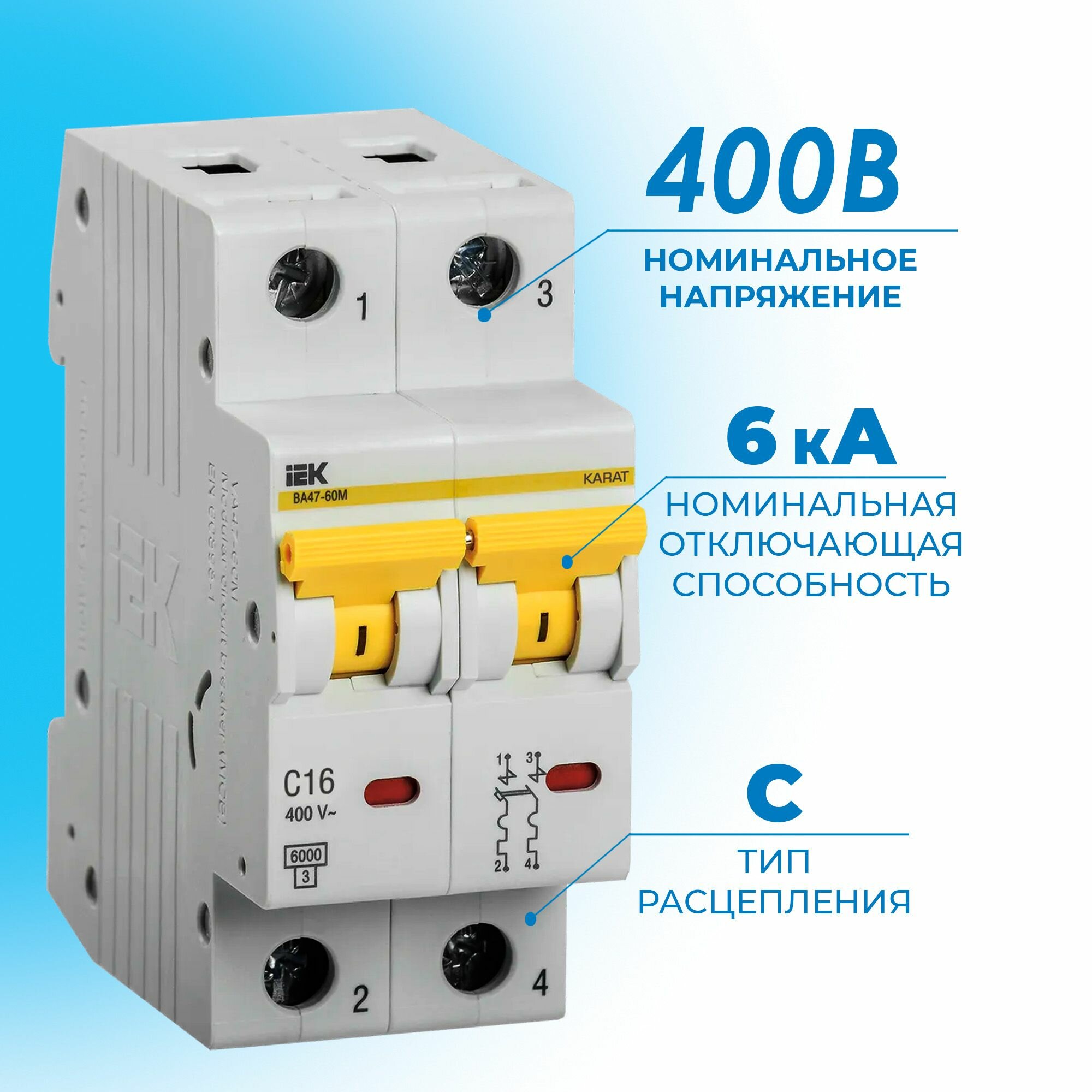 Автоматический выключатель 2P 16A (C) ВА47-60М 6кА iEK информация: