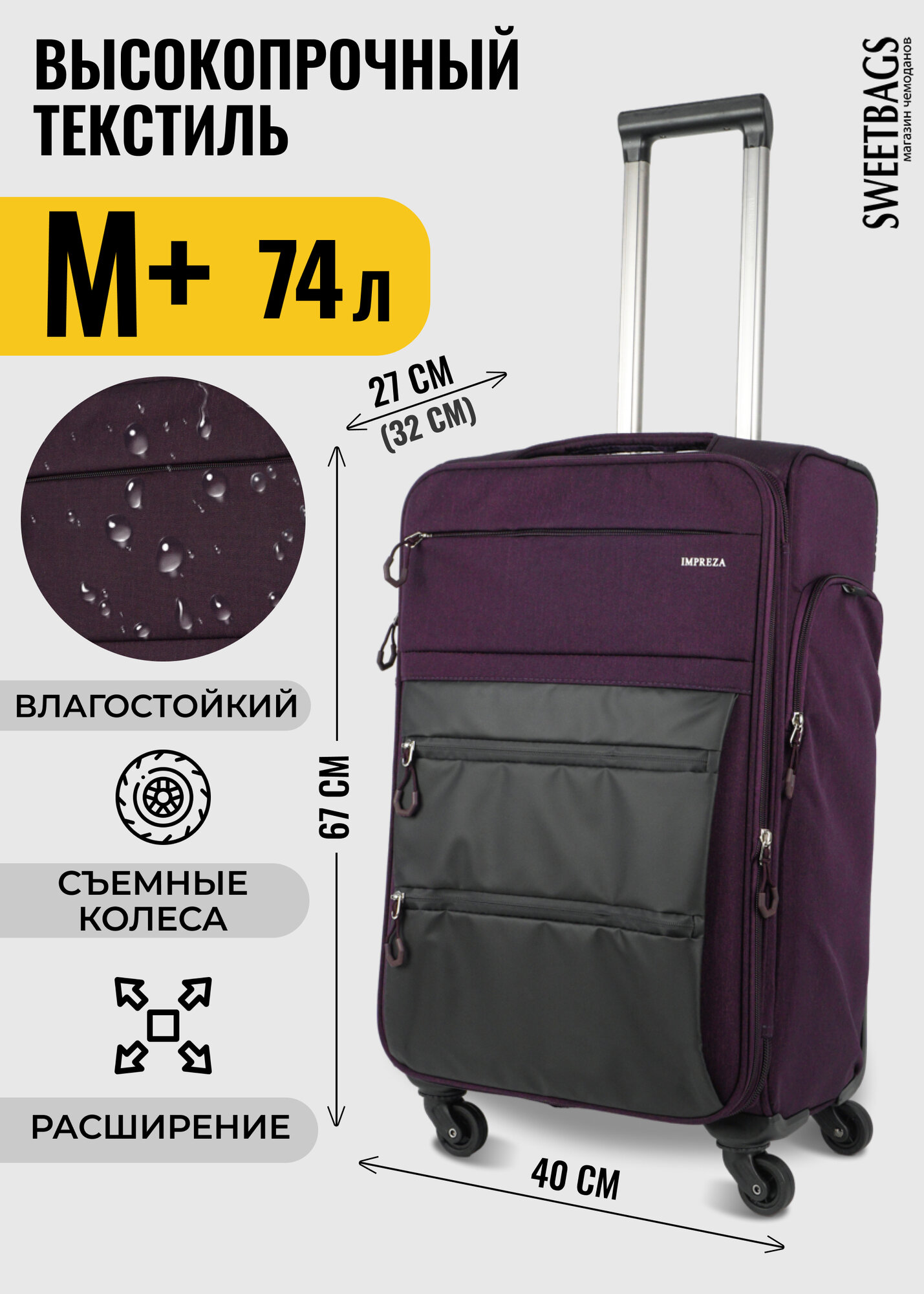 Чемодан Sweetbags текстильный средний с расширением с 4-мя съемными колесами (waterproof) фиолетовый M+ информация: