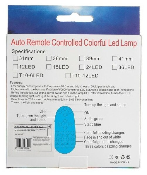 Автолампа светодиодная C5W, 6 SMD, 36 мм, 12 В, мульти свечение, пульт, набор 2 шт информация: