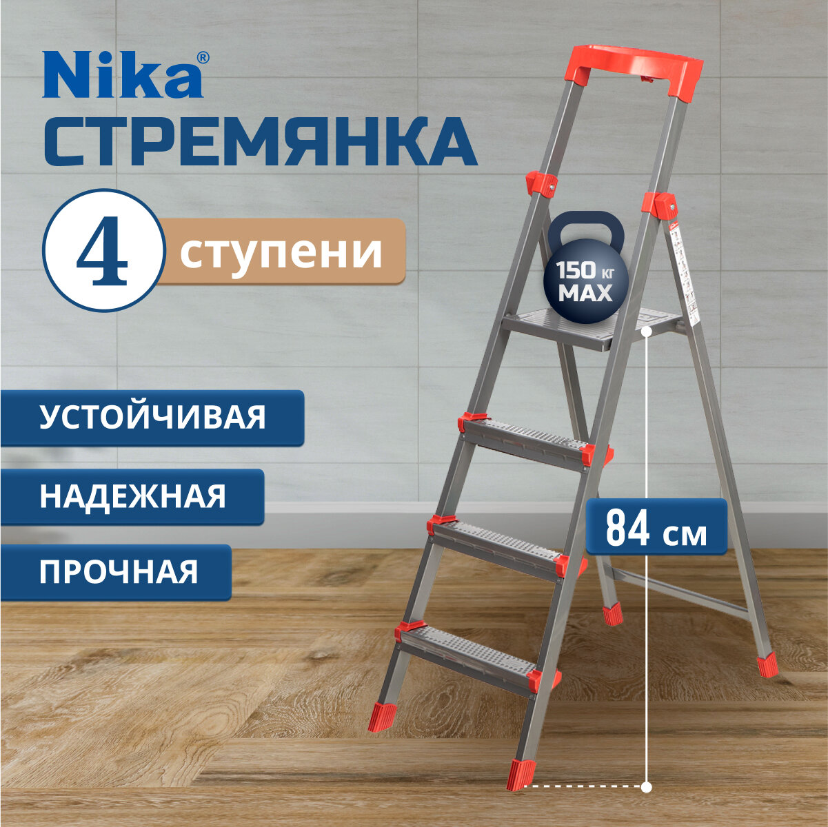 Стремянка 4 ступени, 150 кг, с широкой ступенью, 0.84 м до платформы, Nika, ННСУ4