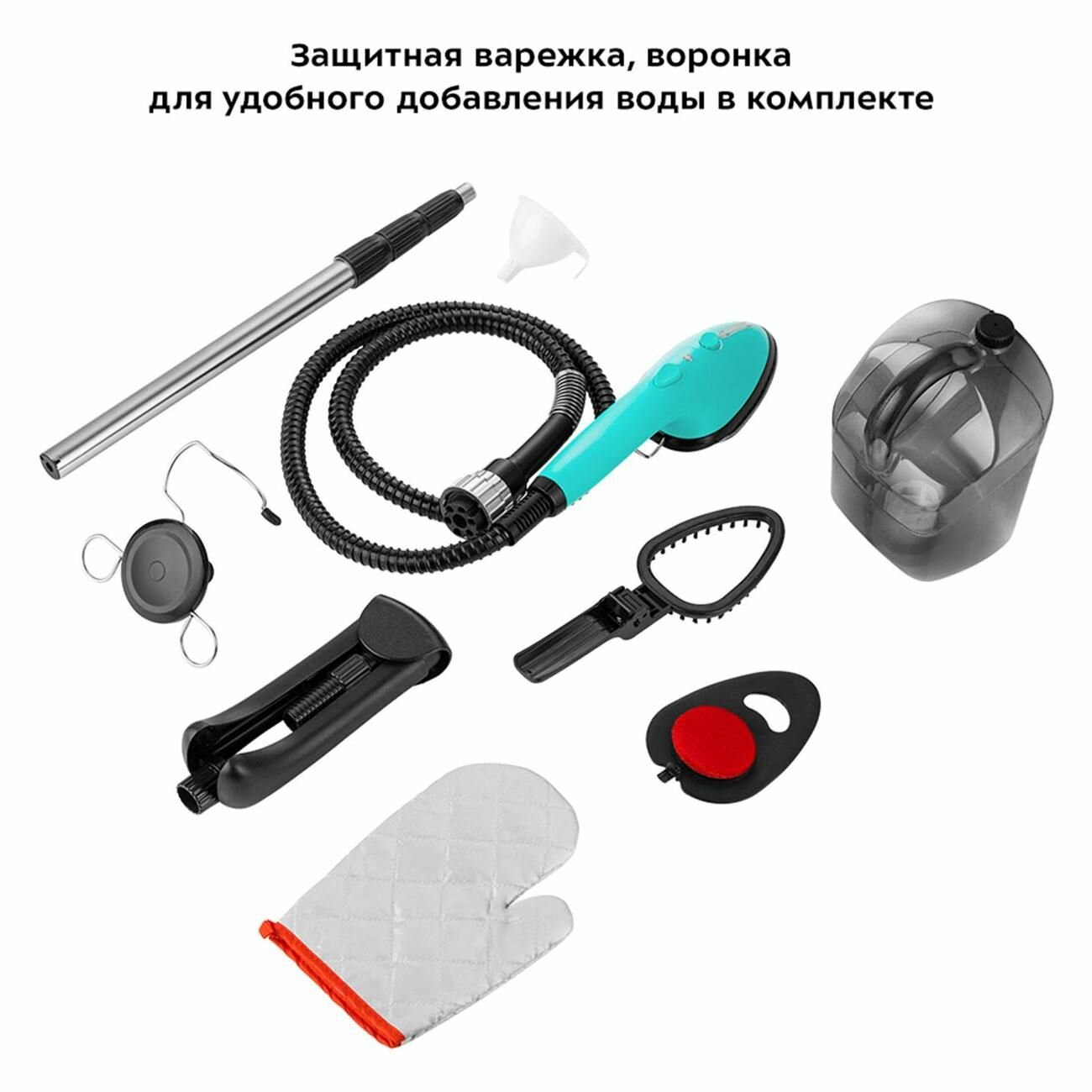 | Дополнительная информация | Комплектация 1. Отпариватель с крышкой разъема парового шланга — 1 шт. 2. Паровой шланг с утюжком — 1 шт. 3. Резервуар для воды с крышкой и блоком фильтров — 1 шт. 4. Телескопическая стойка с гайкой — 1 шт. 5. Держатель утюжка — 1 шт. 6. Складная вешалка с фиксатором — 1 шт. 7. Ворсовая щетка-зажим — 1 шт. 8. Щетка из микрофибры — 1 шт. 9. Защитная варежка — 1 шт. 10. Руководство по эксплуатации — 1 шт. 11. Коллекционный магнит — 1 шт.* *опционально |
