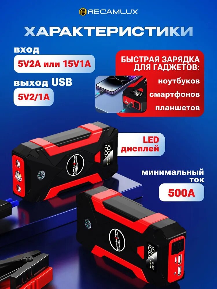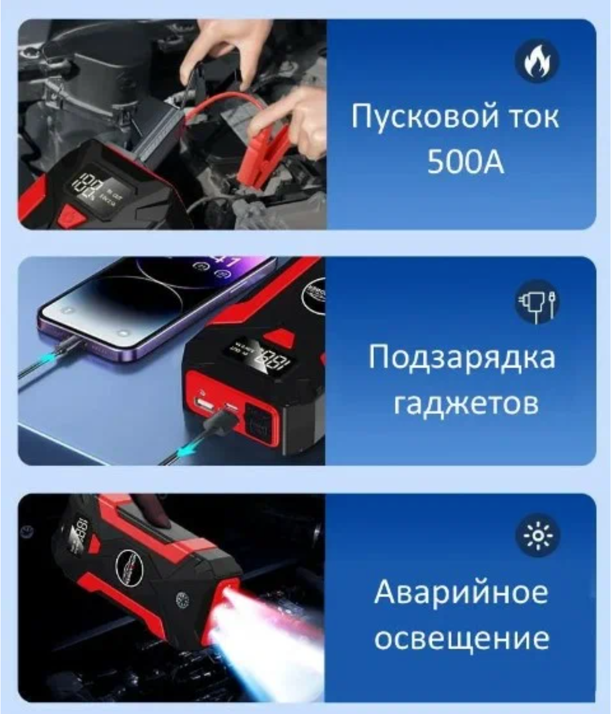 | Комплектация | Пусковое устройство, Сетевое зарядное устройство 220В, Кабель для зарядки гаджетов (Type-C, Lightning, Micro USB), Сетевое зарядное устройство от прикуривателя, Стартовые провода, Чехол |