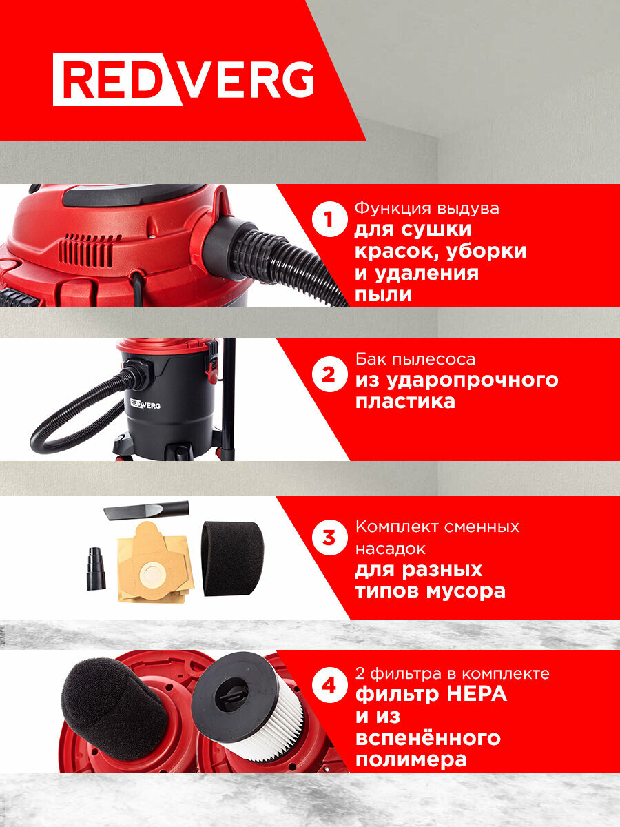 Пылесос строительный RedVerg RD-VC1200S-20P 1200Вт 20л информация: