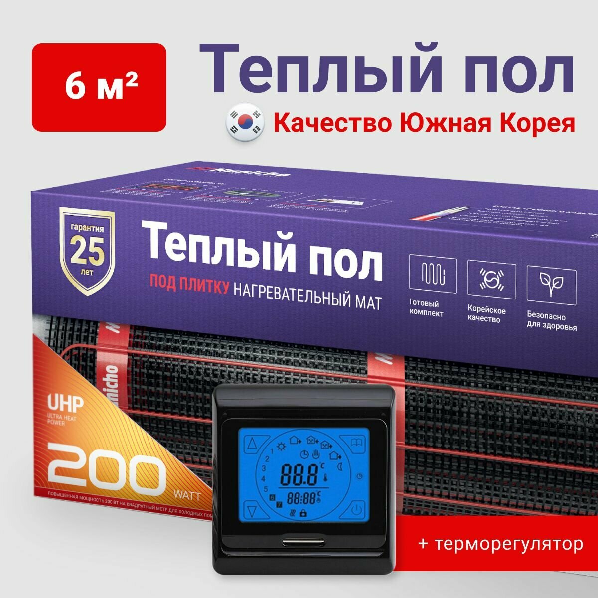 Теплый пол электрический под плитку 1 м2 Nunicho 200 Вт/м2 с терморегулятором сенсорным черным, нагревательный мат пр-во Южная Корея