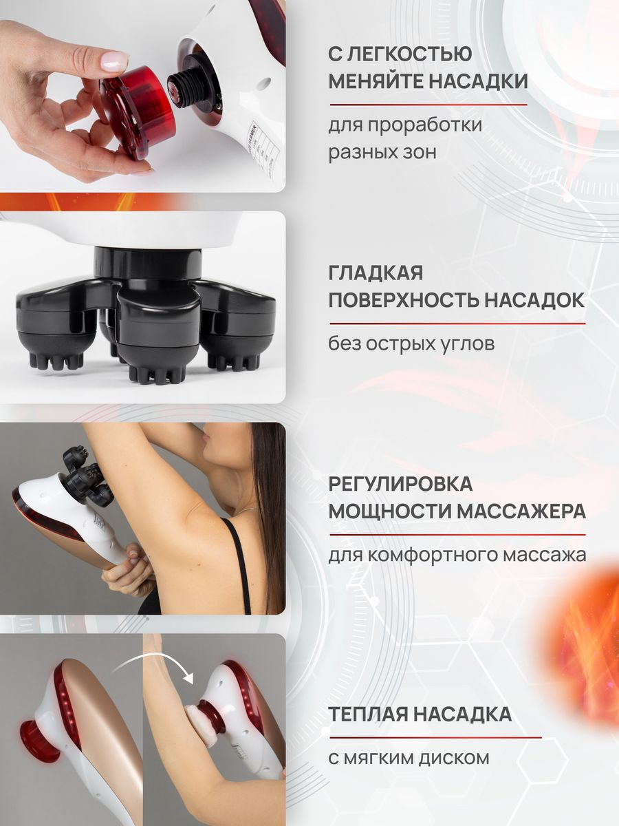 | Зона массажа | бедра / голени / грудная клетка / декольте / живот / ноги / плечи / поясница / пресс / руки / спина / стопы / талия / тело / шея / ягодицы |