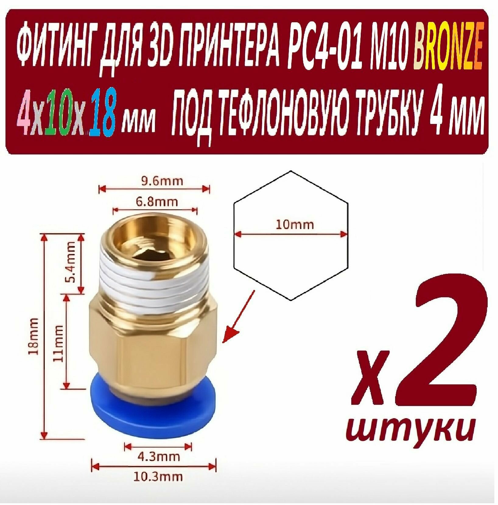 Фитинги PC4-01 M10 Bronze для 3D принтера под тефлоновую трубку 2х4 мм - 2 штуки информация: