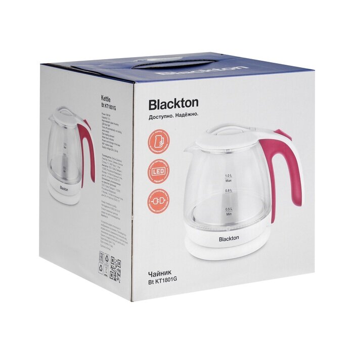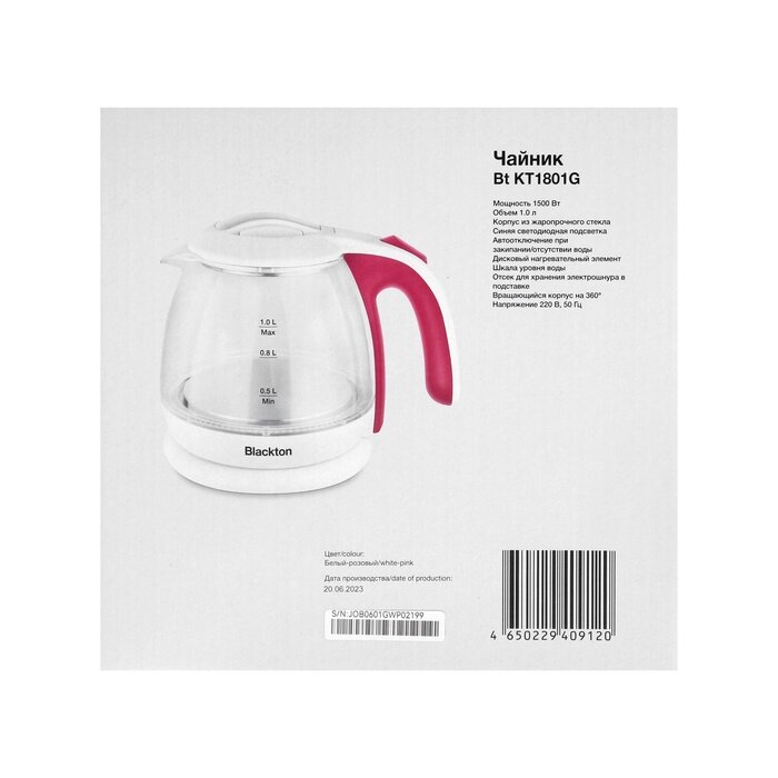 Чайник электрический Blackton Bt KT1801G, стекло,1 л, 1500 Вт, бело-розовый информация: