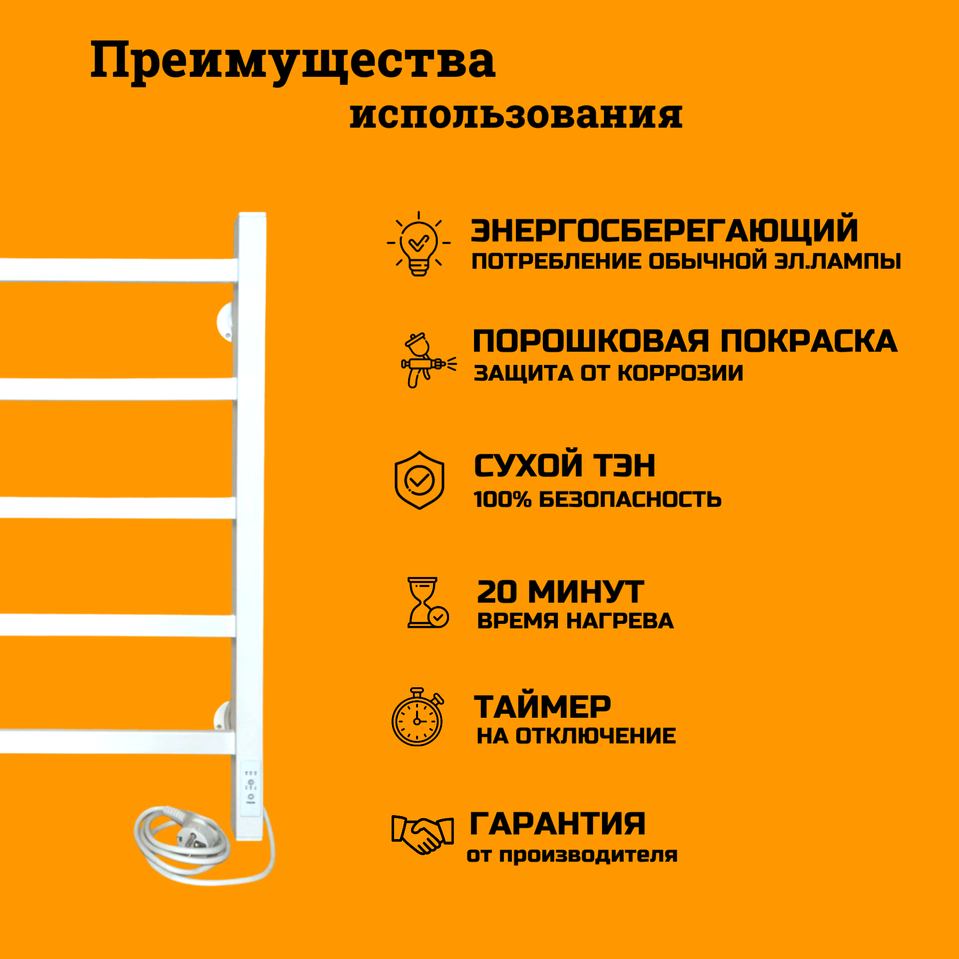 | Дополнительная информация | Данная модель позволяет рационально расходовать электроэнергию, путем регулировки температуры терморегулятором и делает эксплуатацию полотенцесушителя удобной и рациональной, позволяя экономить до 30-40% энергии по сравнению с приборами, работающими постоянно. Температура нагрева регулируется в диапазоне 40-60 градусов ступенчато в 3х режимах: слабый нагрев 40 С, средний нагрев 50 С, максимальный нагрев 60 С. Так же есть возможность выставить таймер отключения. В соответствии с выбранным временем загорится соответствующий светодиод: 2 часа, 4 часа, 6 часов |