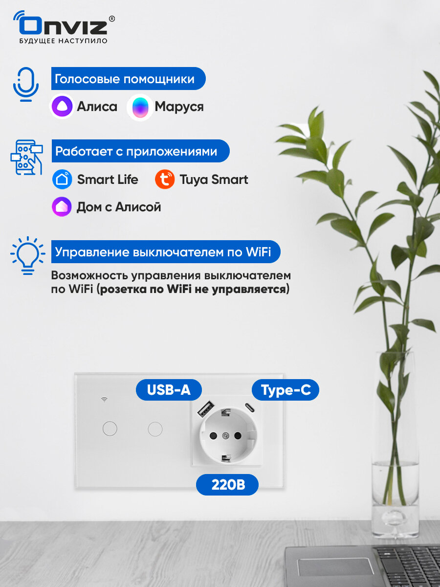 Отзывы на Умный сенсорный Wi-Fi выключатель с Алисой Tuya (белый) 2хклавишный с розеткой USB Type-C, универсальный без нуля и с нулем