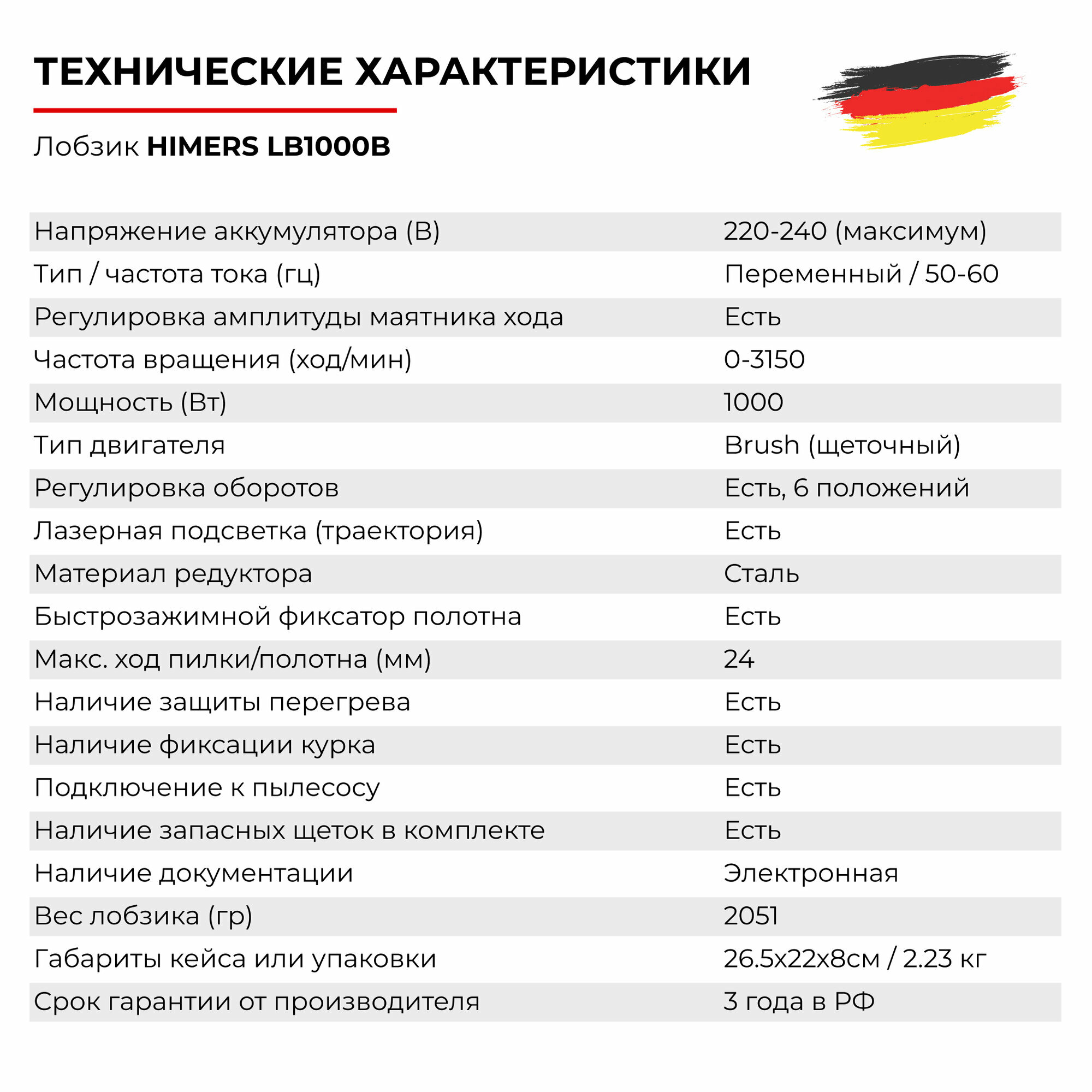 | Комплектация | ОСНОВНАЯ КОМПЛЕКТАЦИЯ: * Тушка лобзика * Ссылка и QR-код на электронное руководство по использованию и гарантийное обслуживание ДОПОЛНИТЕЛЬНАЯ КОМПЛЕКТАЦИЯ: * Тестовые пилки (до 3 шт) * Шестигранник * Защитный кейс * Запасные угольные щетки |