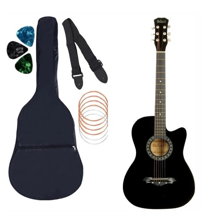 Чёрная Гитара акустическая глянцевая 38" В комплекте: Чехол, Ремень, 6 Струн, Медиаторы, Гитара Belucci BС3810