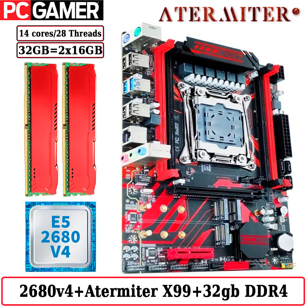 10 цен на Комплект материнская плата Atermiter X99 D4 + Xeon 2680V4 + 32GB DDR4 ECC REG 2x16GB RED