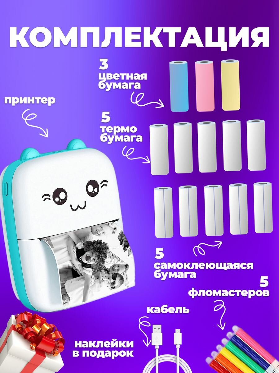 Портативный принтер для фото мини для детей , голубой информация: