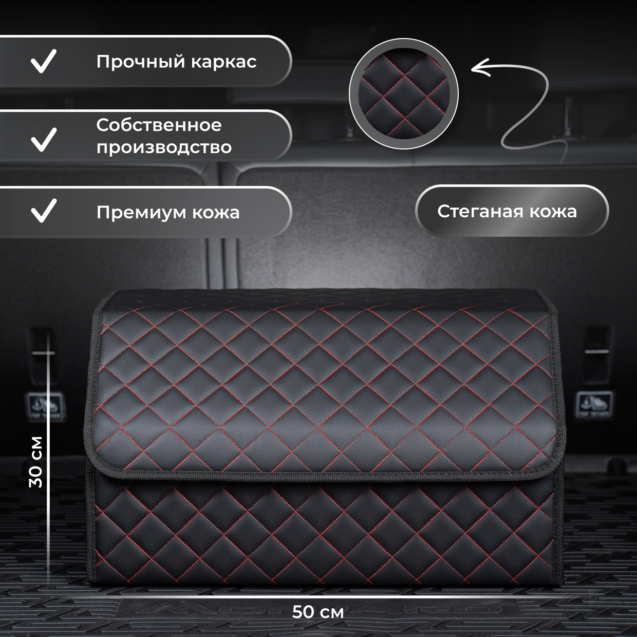 Сумка-органайзер в багажник Хонда хр-в (1998 - 2001) внедорожник 3 двери / Honda HR-V, экокожа , Черный с красной строчкой, Размер М:30x30x55см
