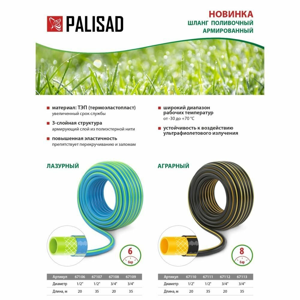 Отзывы на Шланг поливочный армированный 3 слойный ТЭП 1/2"", 20 м, лазурный Palisad [67106]