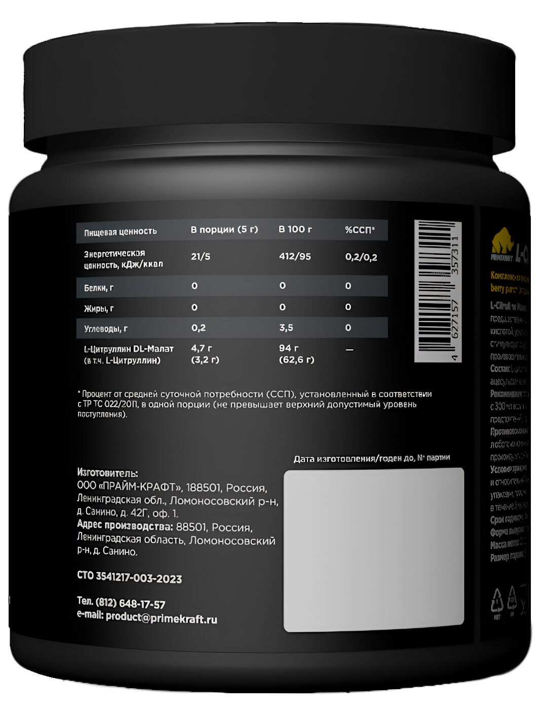 Л-Цитруллин Малат Prime Kraft L-Citrulline Malate - 200 грамм, ягодный пунш информация: