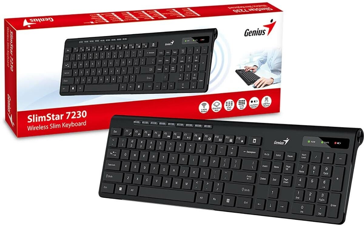 Клавиатура беспроводная мультимедийная Genius SlimStar 7230. 12 мультимедийных клавиш, тонкие клавиши, 2.4ГГц, поддержка приложения Genius Key support