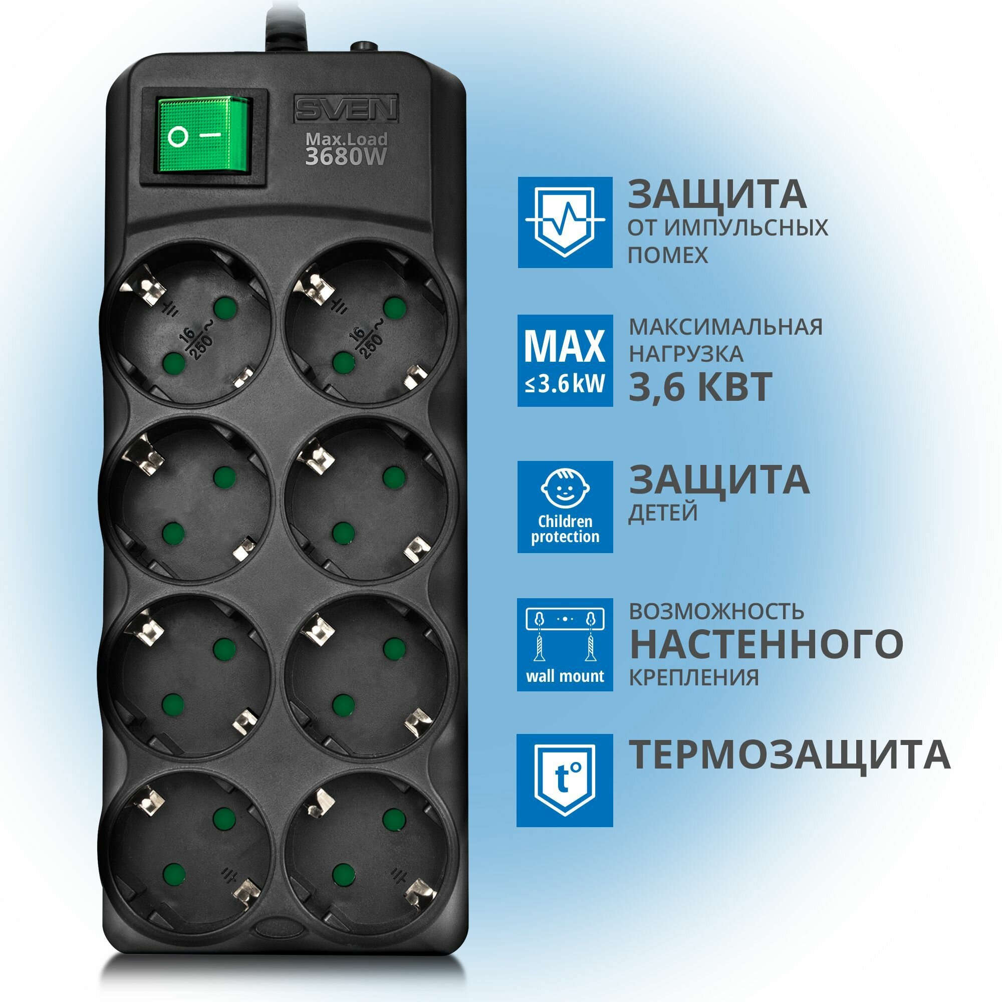 Sven Сетевые фильтры Фильтр SF-08E-16 3,0 м 8 розеток с защитными шторками,16А черный, цветная коробка SV-021610 информация: