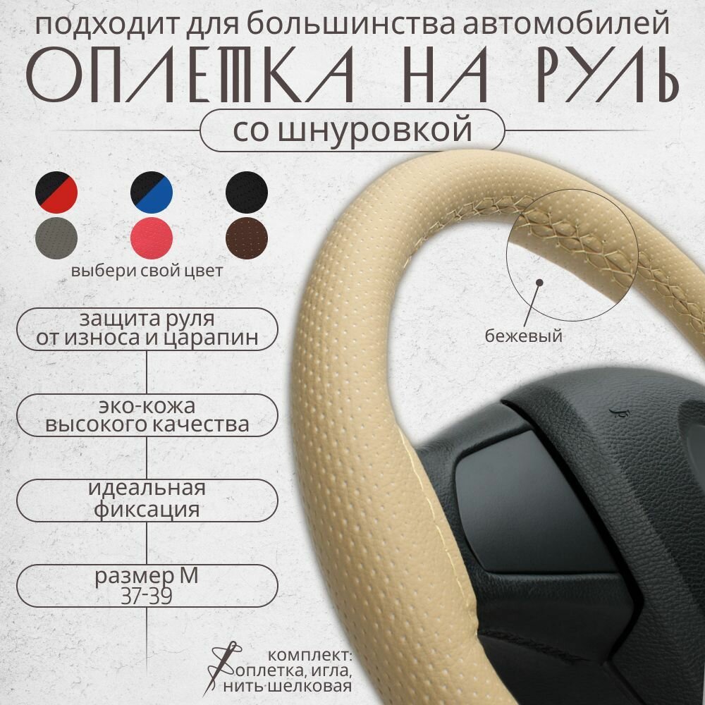 Оплетка на руль 37-39 см эко кожа со шнуровкой для автомобиля, чехол на руль универсальный (бежевый) информация: