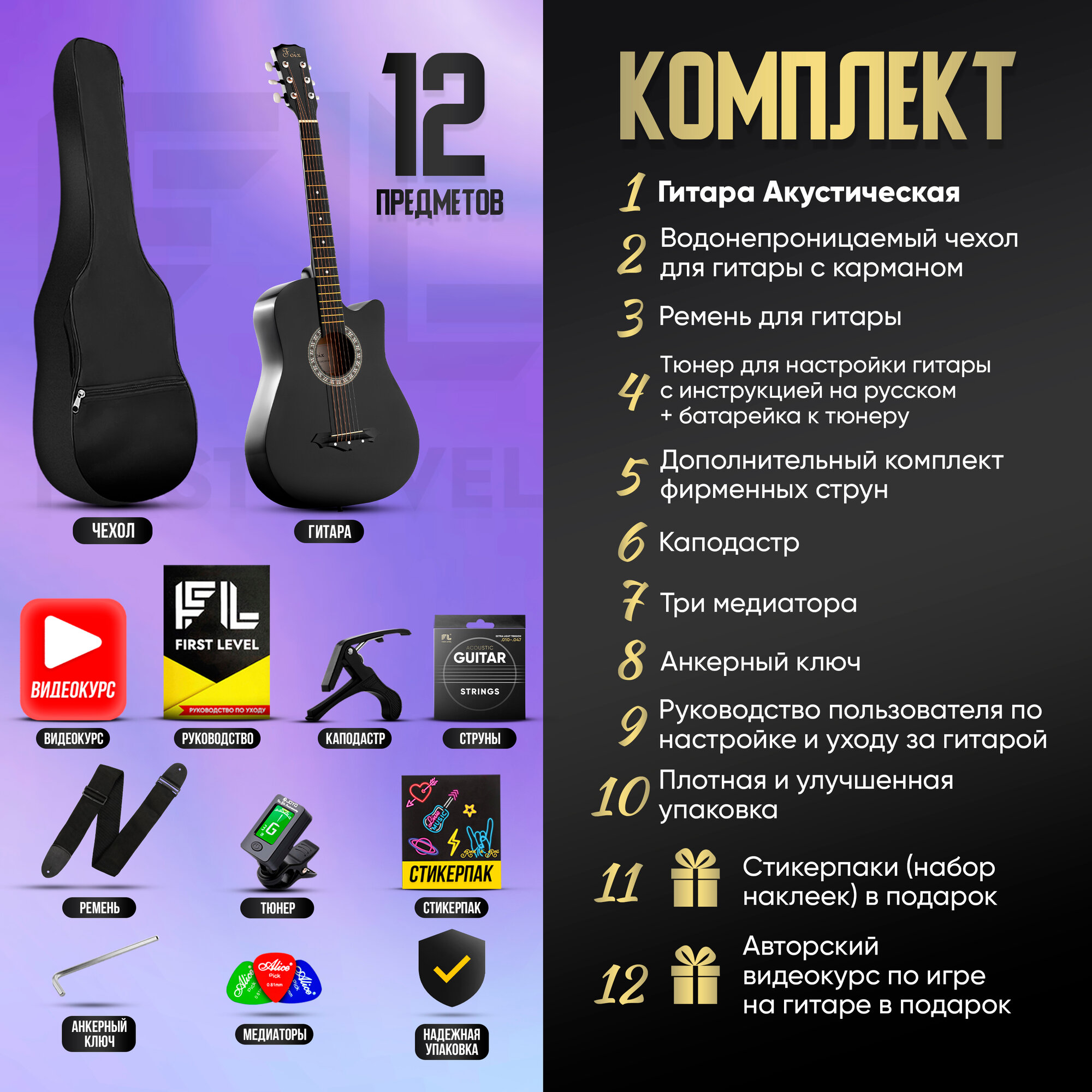 | В комплекте | 1. Гитара акустическая, размер 38" (7/8); 2. Водонепроницаемый чехол для гитары c карманом; 3. Дополнительный комплект фирменных струн; 4. Ремень для гитары; 5. Тюнер для настройки гитары с инструкцией на русском языке + батарейка к тюнеру; 6. Каподастр; 7. Три медиатора; 8. Анкерный ключ; 9. Руководство пользователя по настройке и уходу за гитарой + Авторский видео курс по игре на гитаре в подарок! 10. Стикерпаки (набор наклеек) в подарок! |