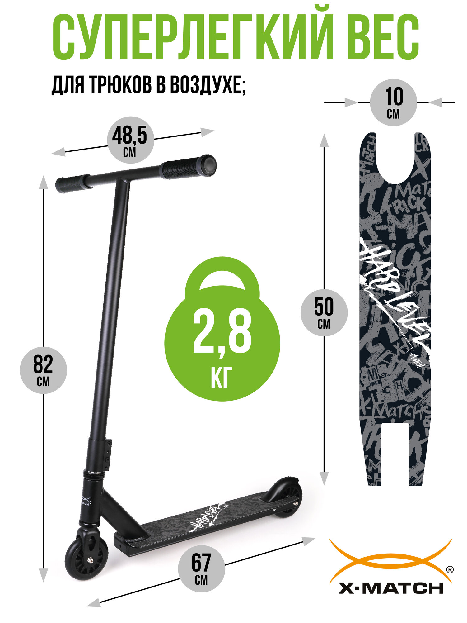 Самокат трюковой X-Match Hard Level, 100 мм. PU, дека 50х10 см. алюмин, руль сталь