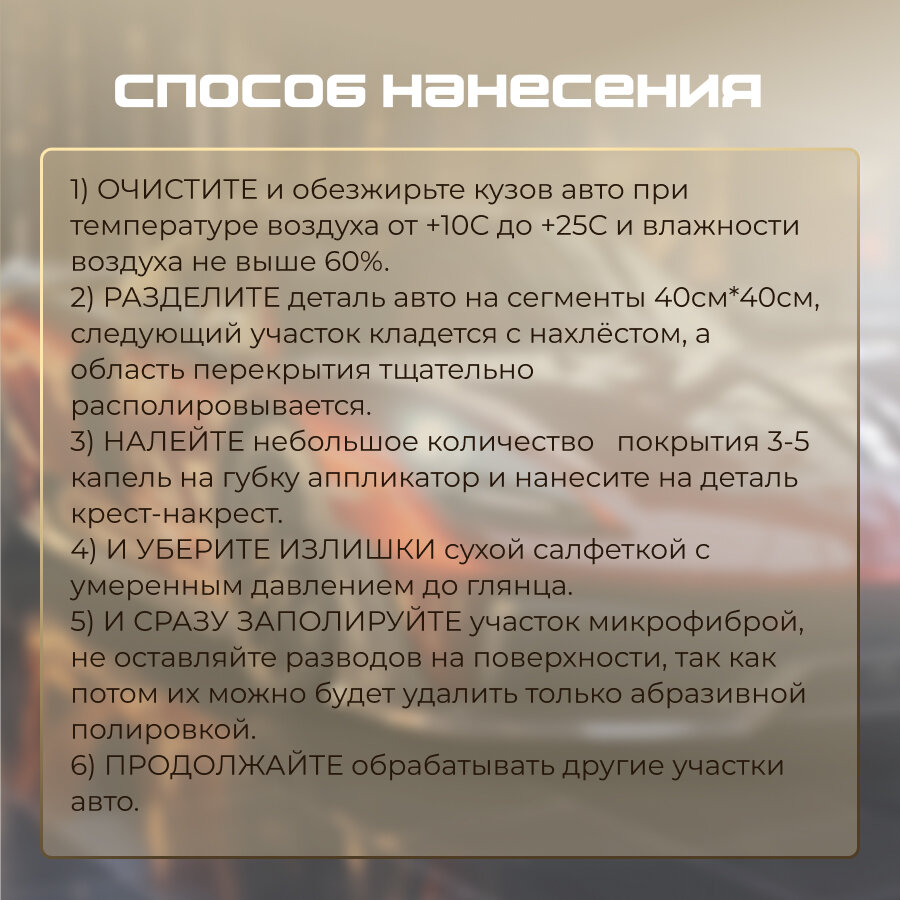 | Способ применения | 1. Очистите и обезжирьте кузов авто при температуре воздуха от +10С до +25С и влажности воздуха не выше 60%. 2. Разделите деталь авто на сегменты 40см*40см, следующий участок кладется с нахлёстом, а область перекрытия тщательно располировывается. 3. Налейте небольшое количество покрытия 3-5 капель на губку аппликатор и нанесите на деталь крест-накрест. 4. Уберите излишки сухой салфеткой с умеренным давлением до глянца. 5. И сразу заполируйте участок микрофиброй, не оставляйте разводов на поверхности, так как потом их можно будет удалить только абразивной полировкой. 6. Продолжайте обрабатывать другие участки авто. |