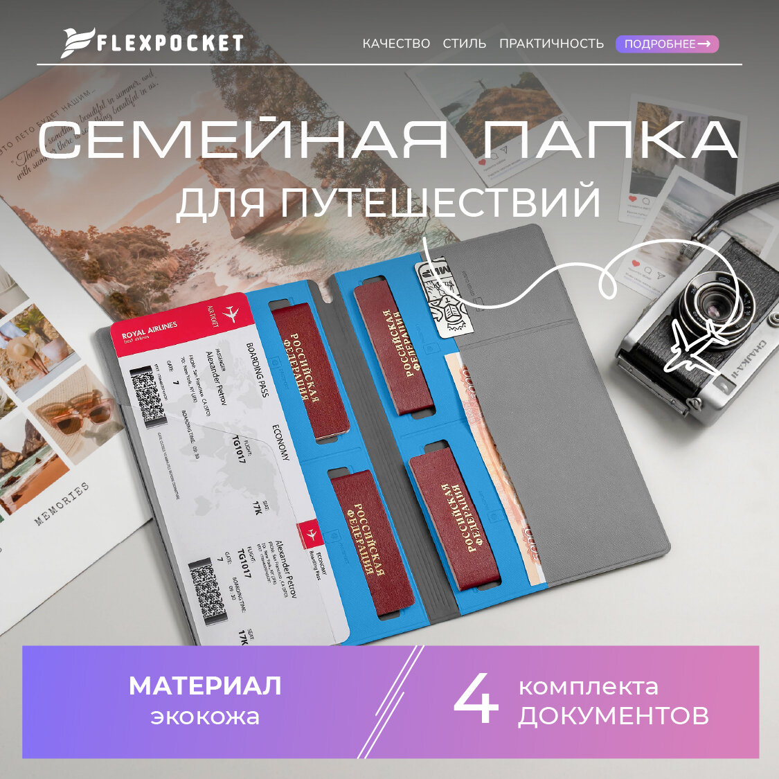 Органайзер для путешествий семейный Flexpocket / Турконверт / Авиахолдер / Папка для документов, загранпаспорта, цвет Светло-серый информация: