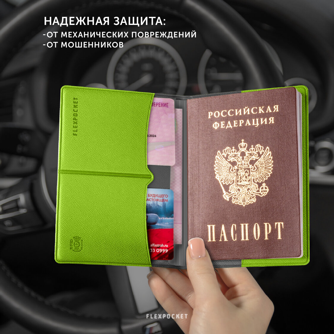 Отзывы на Обложка для паспорта с RFID защитой для карт, отделением для документов снилс, СТС, Flexpocket, цвет зеленый