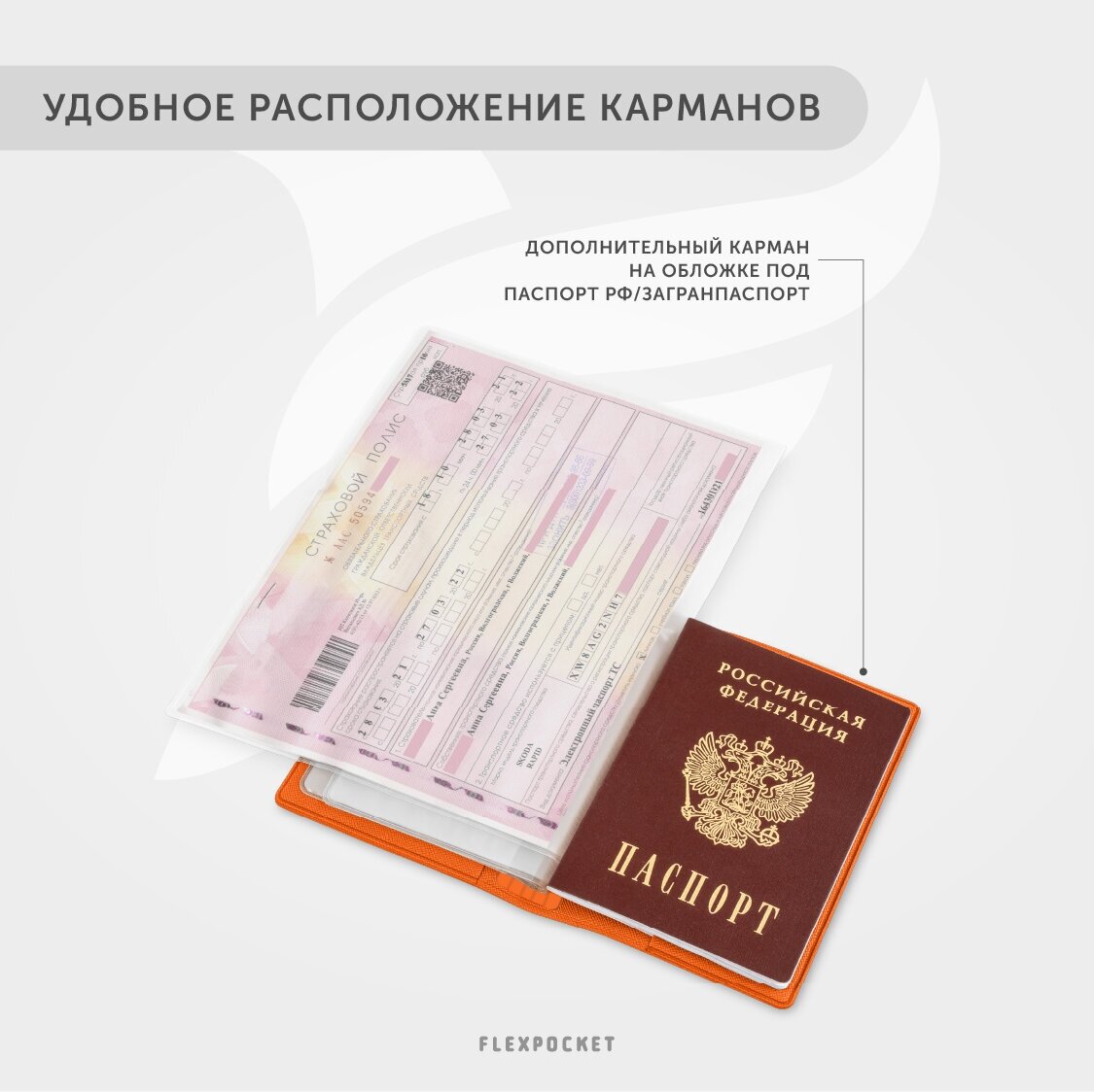 Обложка для автодокументов, водительских прав, удостоверения, СТС, осаго Flexpocket, автодокументница, цвет оранжевый информация: