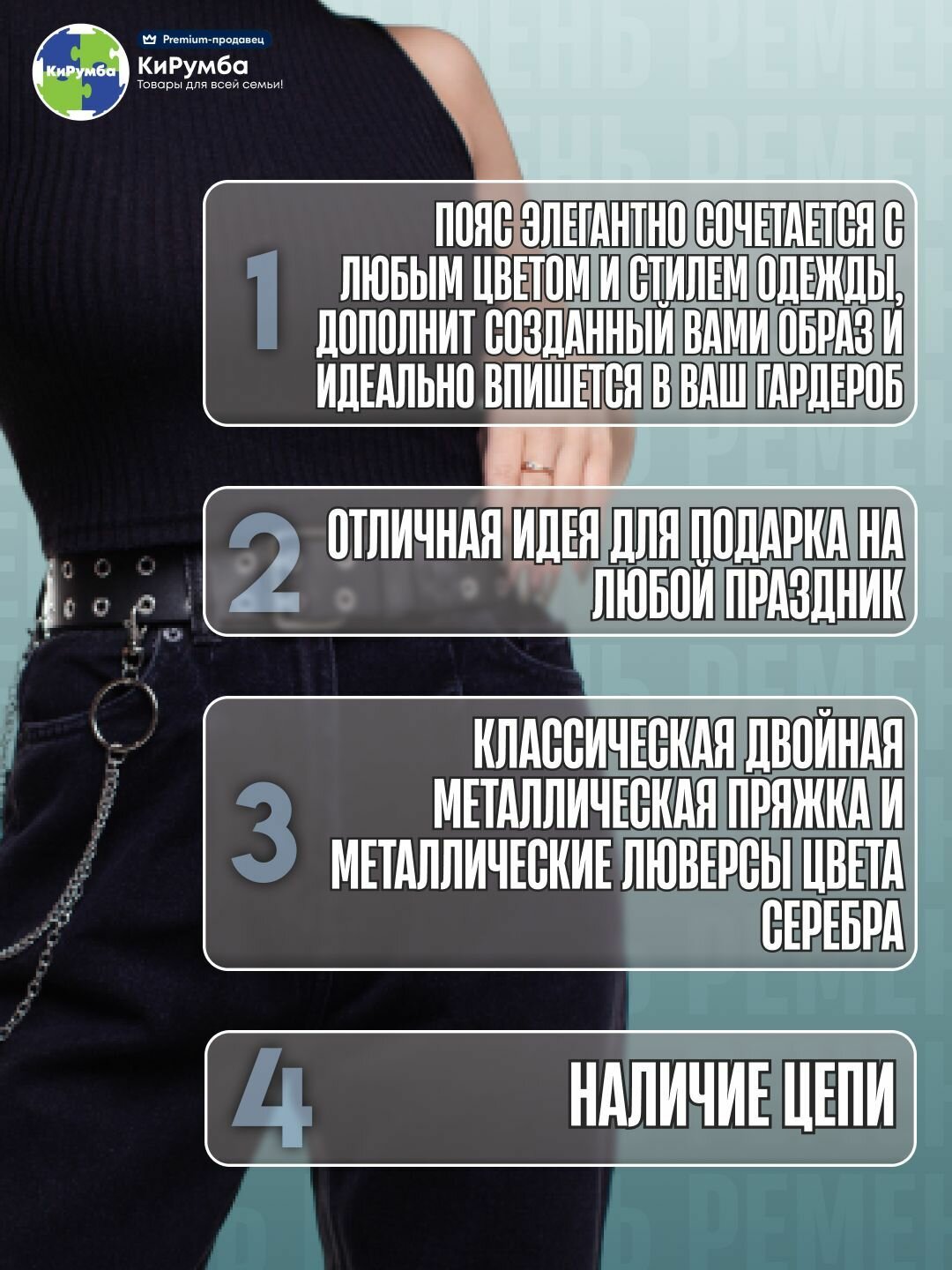 | Комплектация | Ремень с люверсами и цепочкой; индивидуальная упаковка |