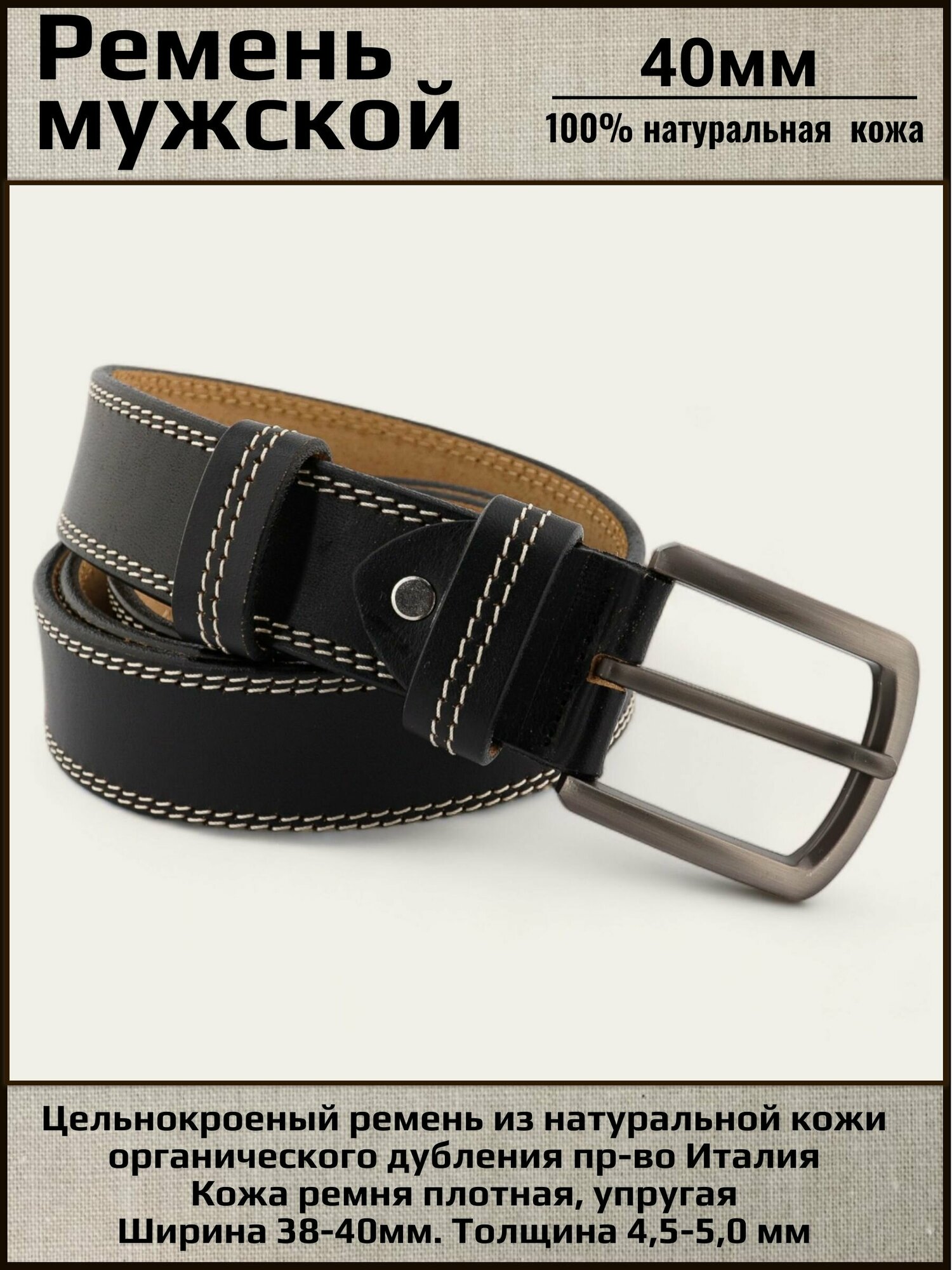 Ремень мужской кожаный Aksy Belt черный, 40мм, белая строчка, Италия, 115 см информация: