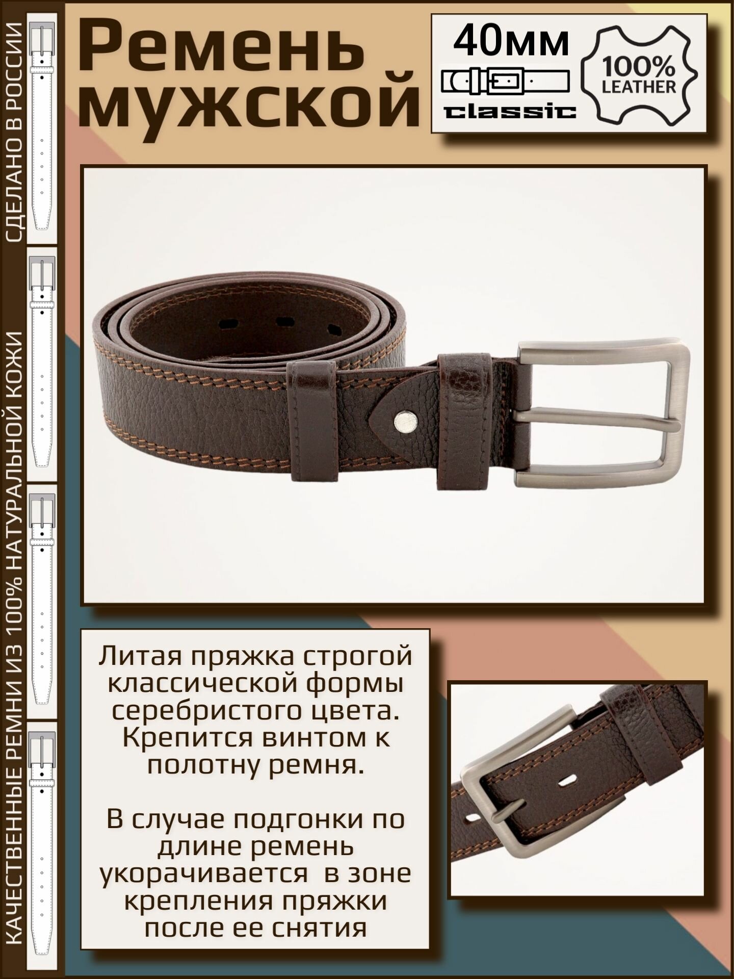 10 цен на Ремень мужской кожаный, AKSY BELT, 40 мм, коричневый, фактурный, 2 строчка, 110 см (BPr C40-078 зерн СТР)
