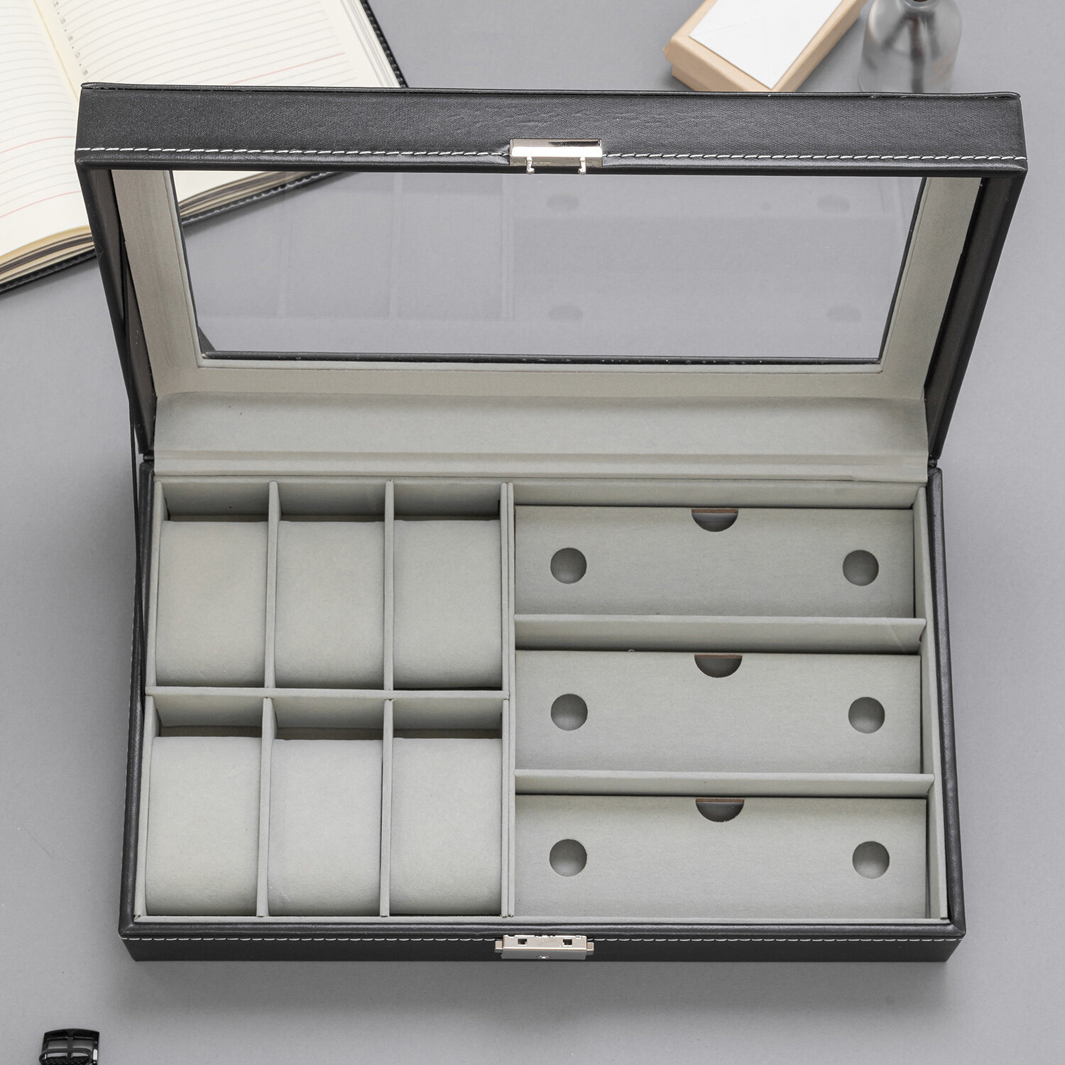 Шкатулка для хранения 6 наручных часов и 3 очков CloxBox W75-B Черная экокожа информация: