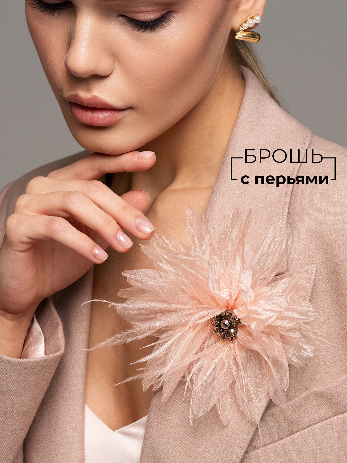 10 цен на Брошь цветок из ткани с натуральными перьями бежевая