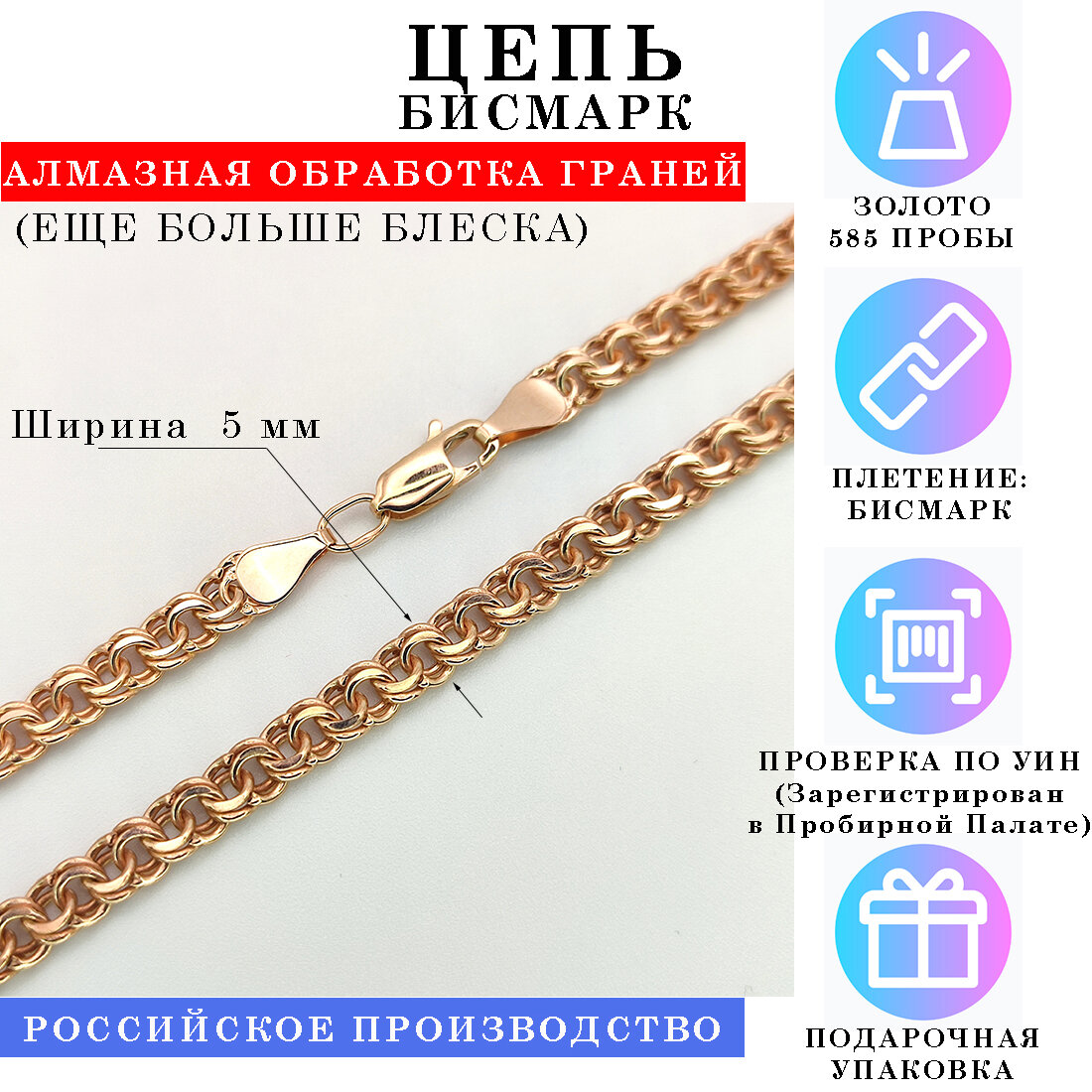 Цепь бисмарк золотая, 585 проба, красное золото, размер 55 см. информация: