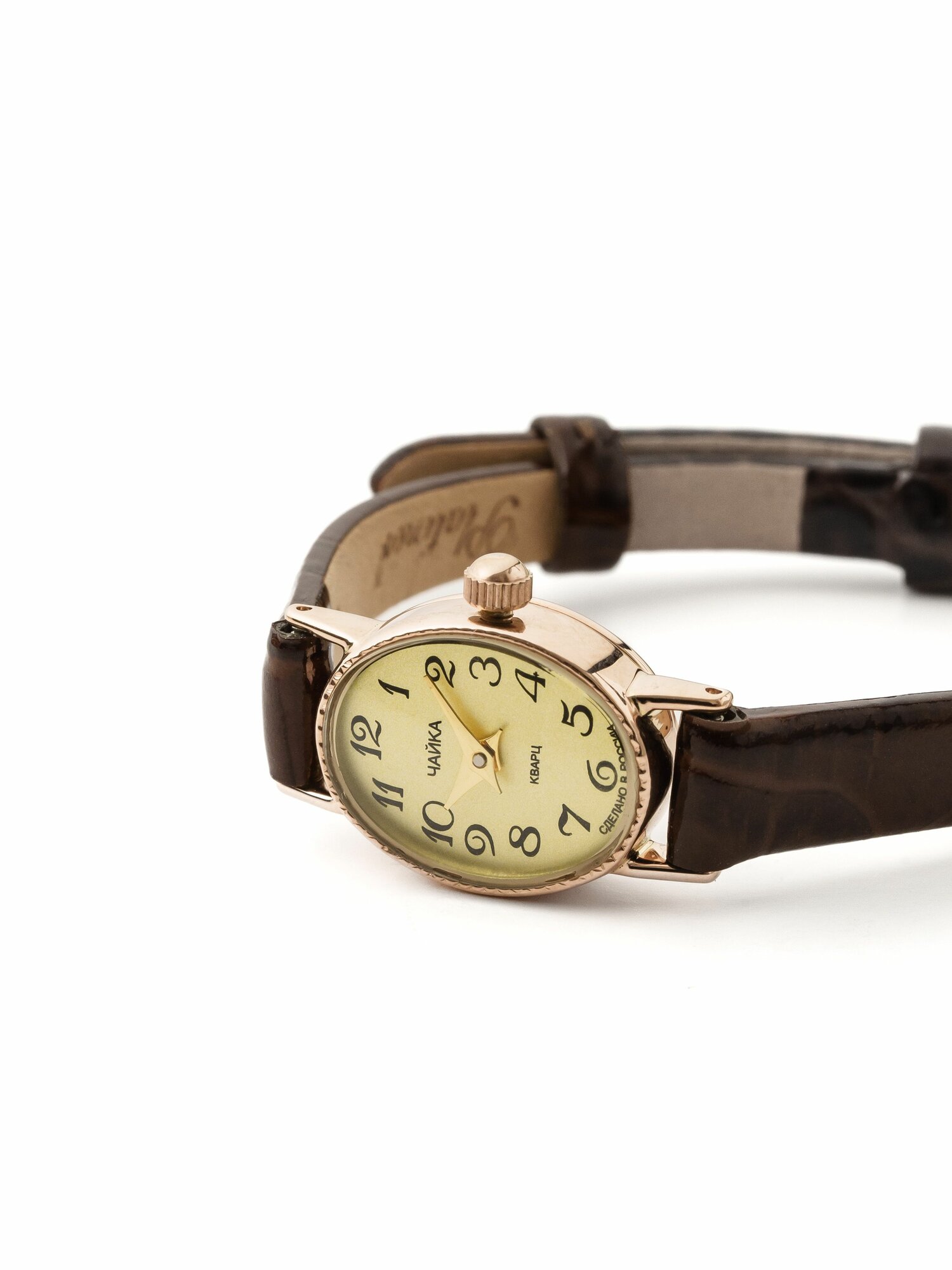 10 цен на Чайка, Часы наручные женские золотые кварцевые с кожаным ремешком "Нежность" 44330-2.405