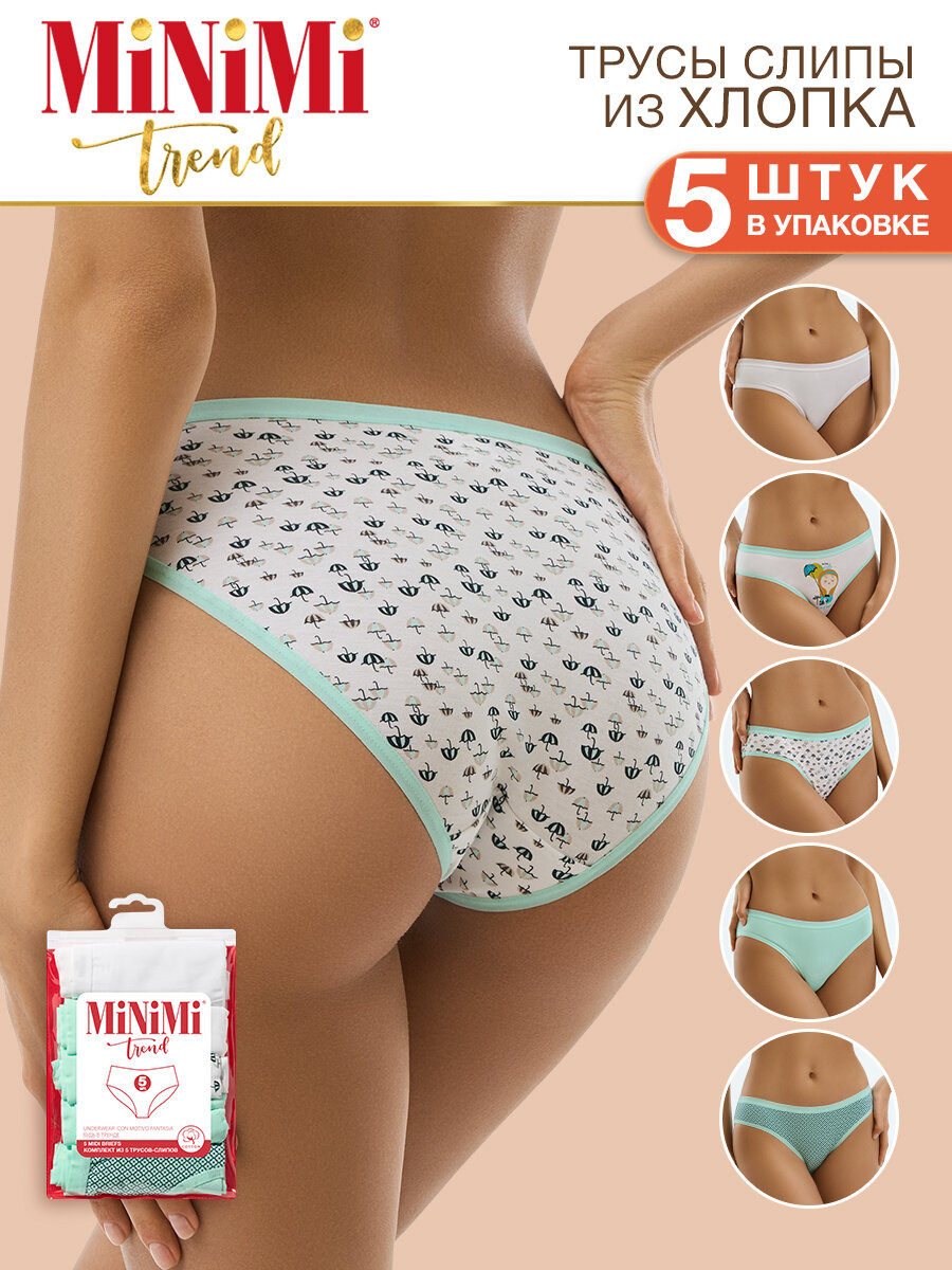 10 цен на Трусы женские MiNiMi MULTIPACK "Зонтики", набор 5 штук, слипы со средней линией талии и узкой боковиной Цвет Menta/Multicolor размер 46 (M)